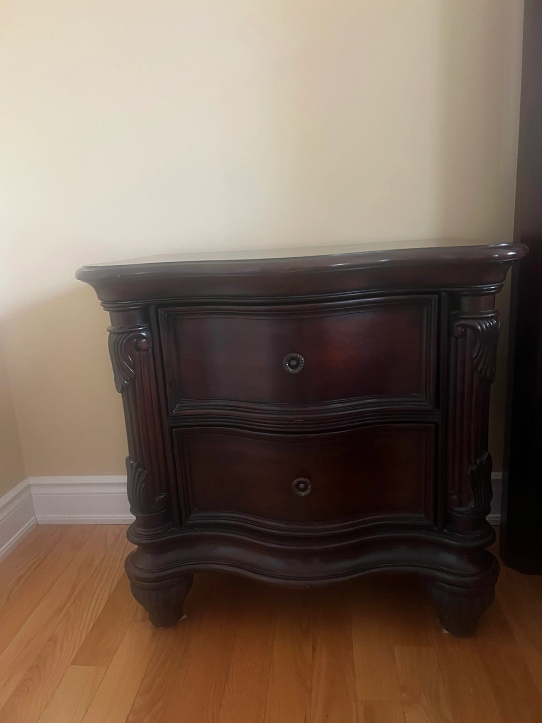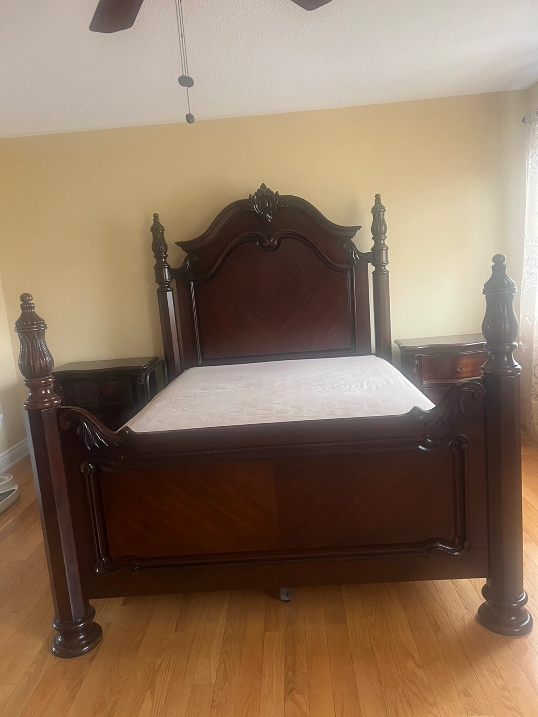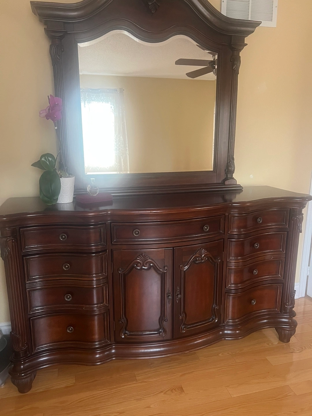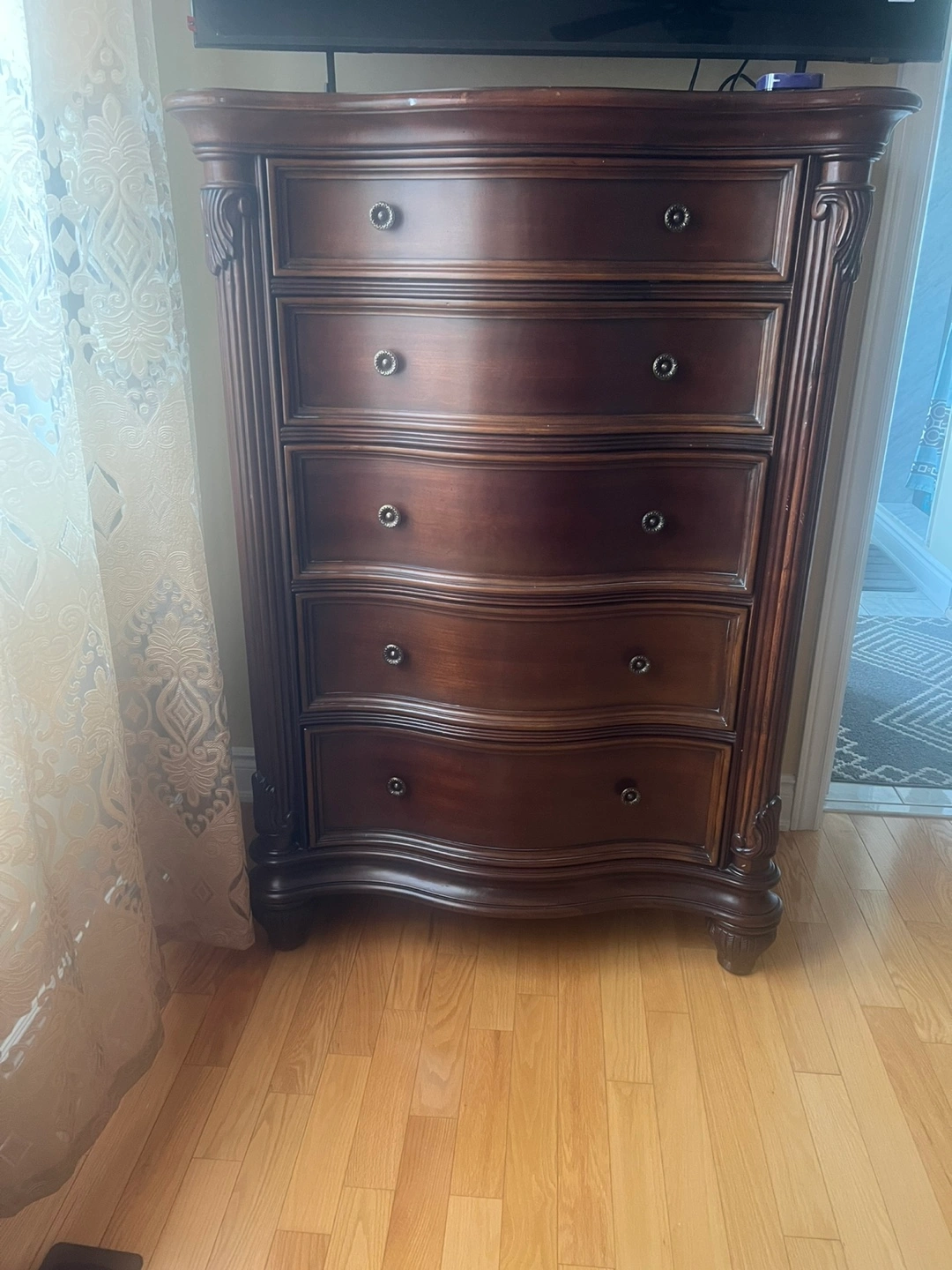 Beautiful bedroom set, dark brown wood finish. Includes queen size bed frame, tall chest of drawers, two nightstands, and a dresser with mirror. Elegant style, ornate details. Solid wood construction. Minor wear.Moving sell