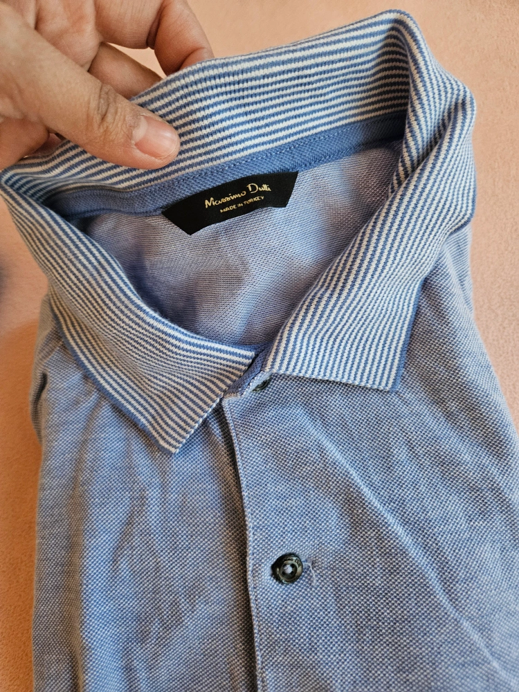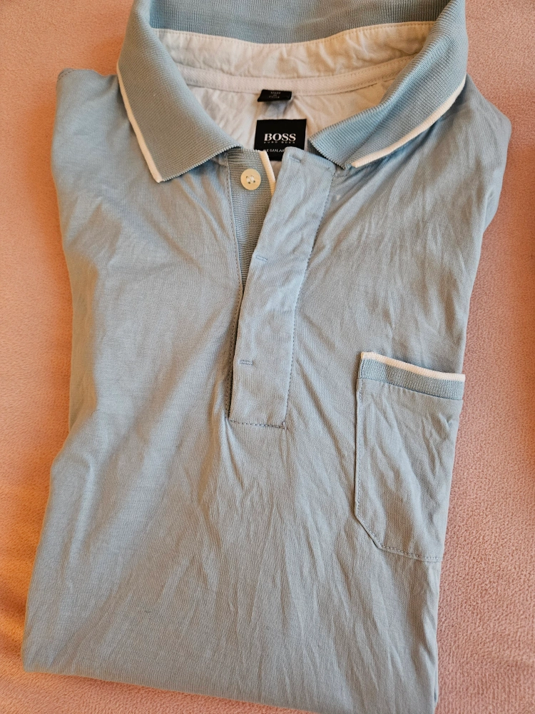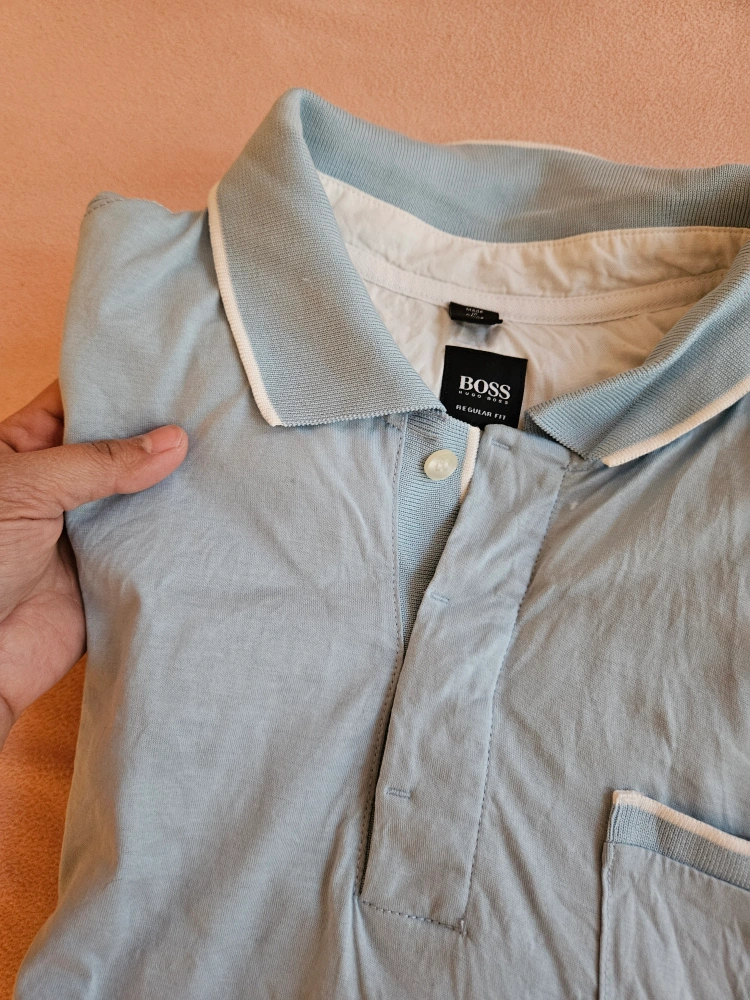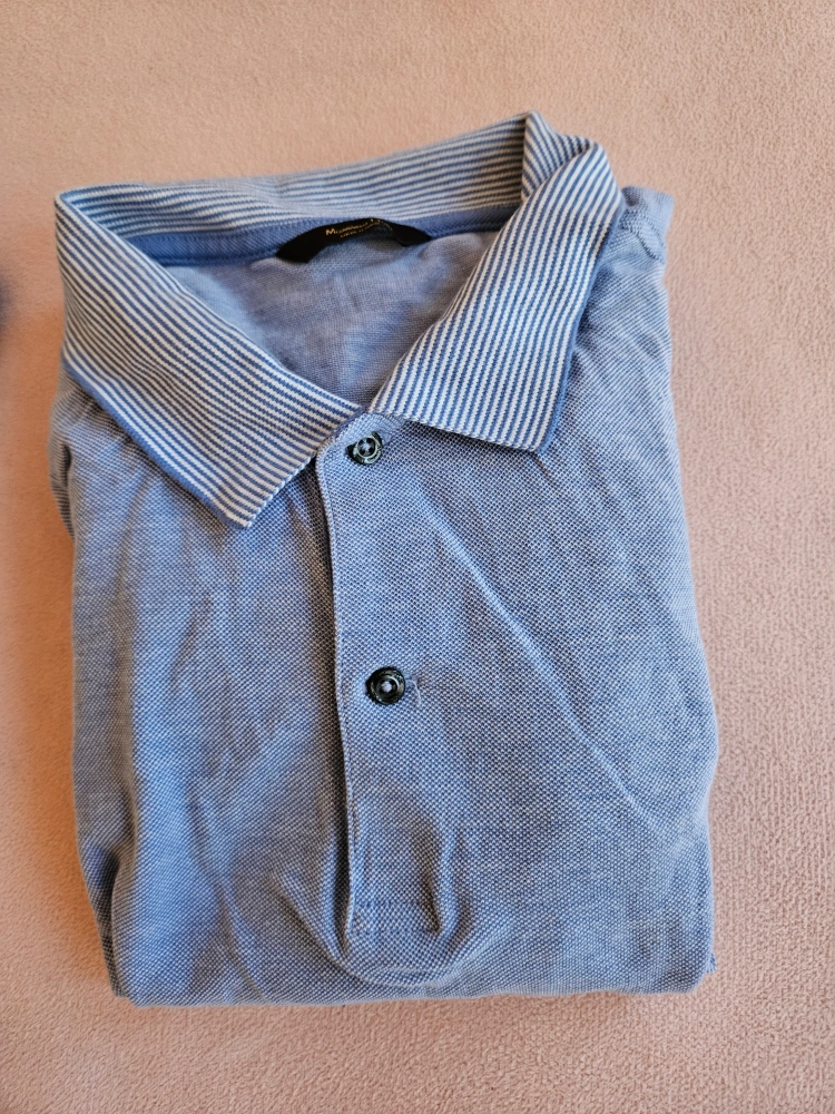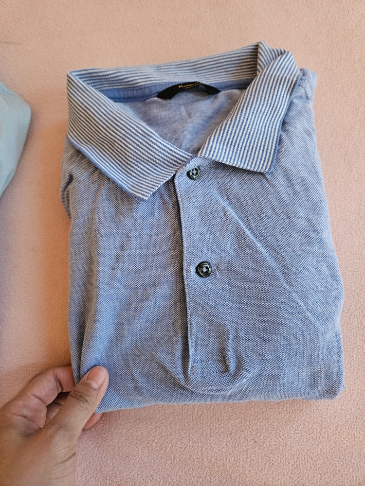 Two men's light blue polo shirts. One features a striped collar and is made in Italy. The other has a white trimmed collar and a chest pocket. Both are short sleeve.
