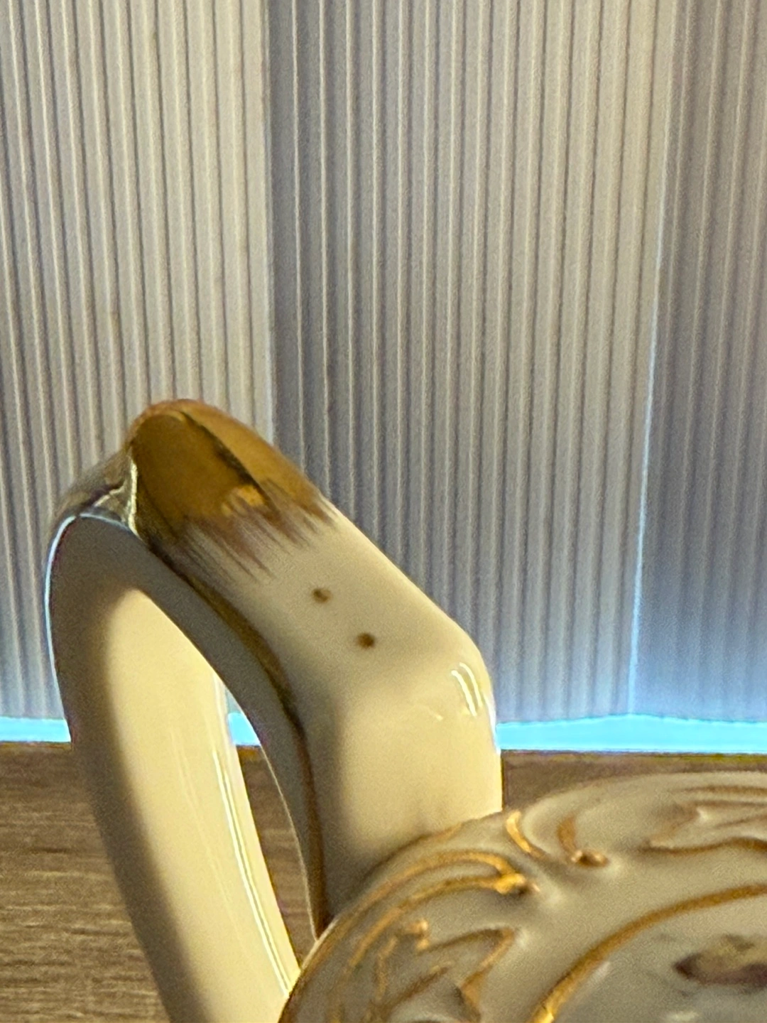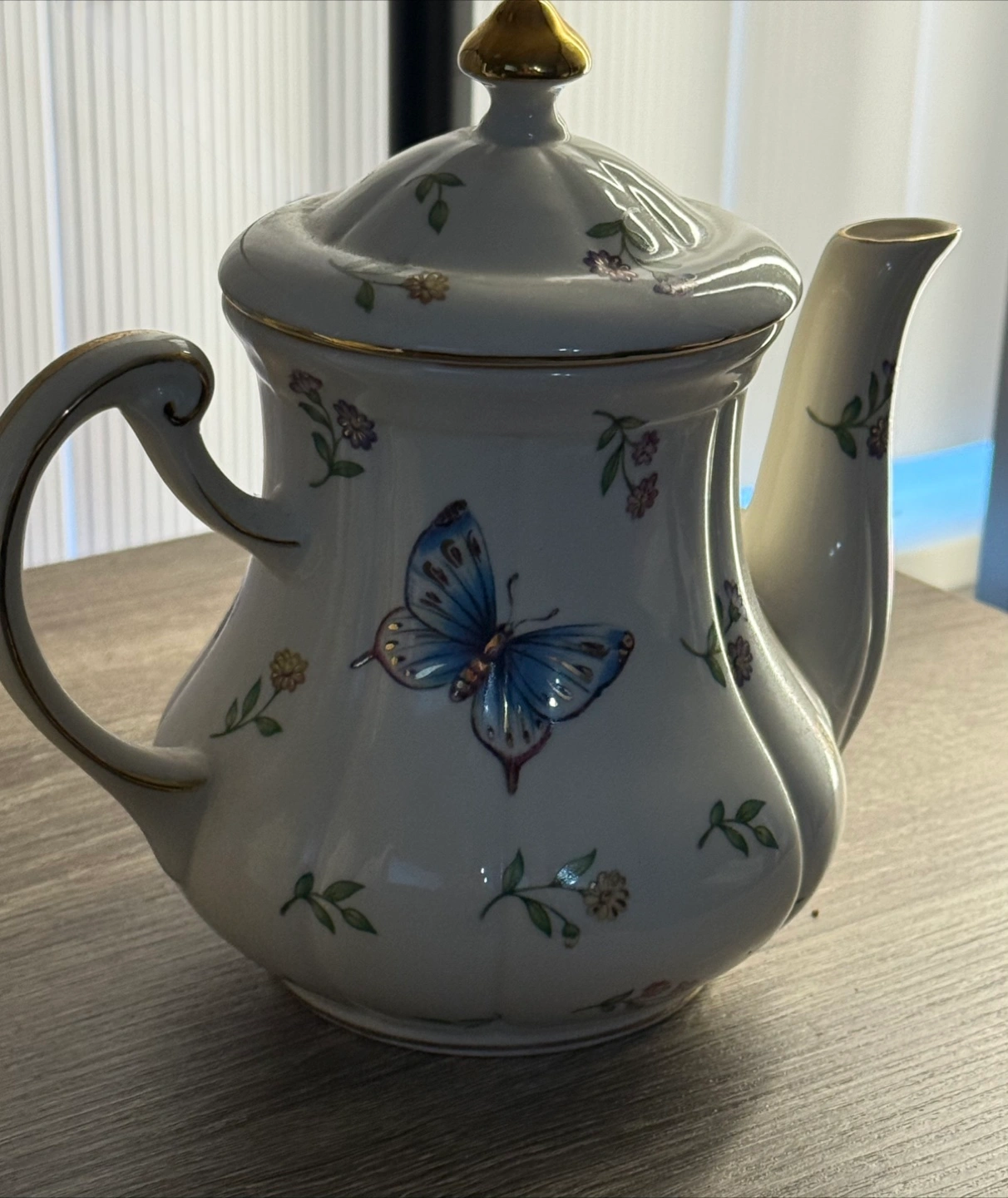 Cream-coloured teapot. 24kt Gold detailing. Floral and insect accents. Lidded. Includes a handle and spout. Matching. One is dainty, and makes tea for one; the other is bigger and you can make tea for yourself and another. Buy one for $40 each, or both for $60.