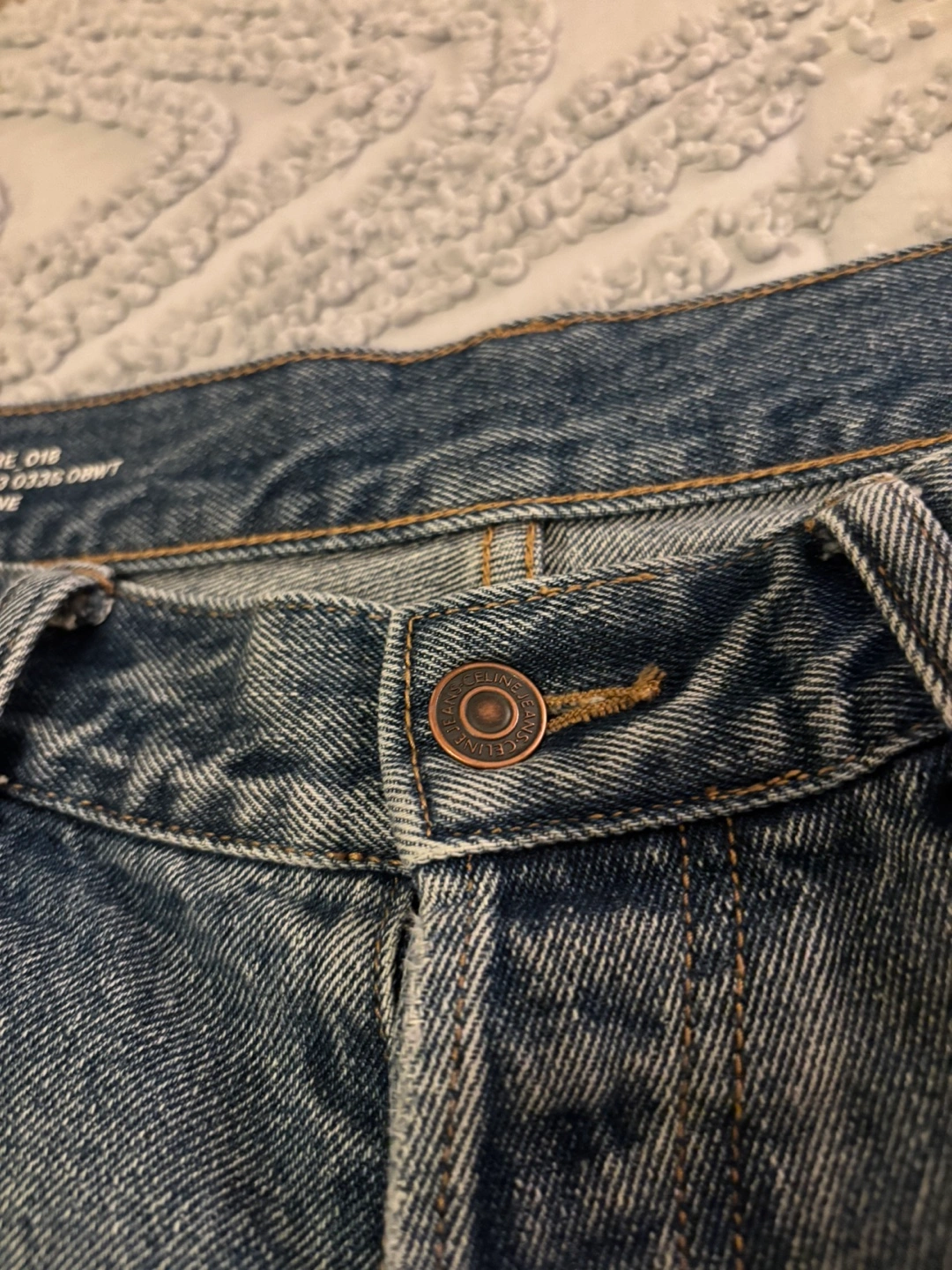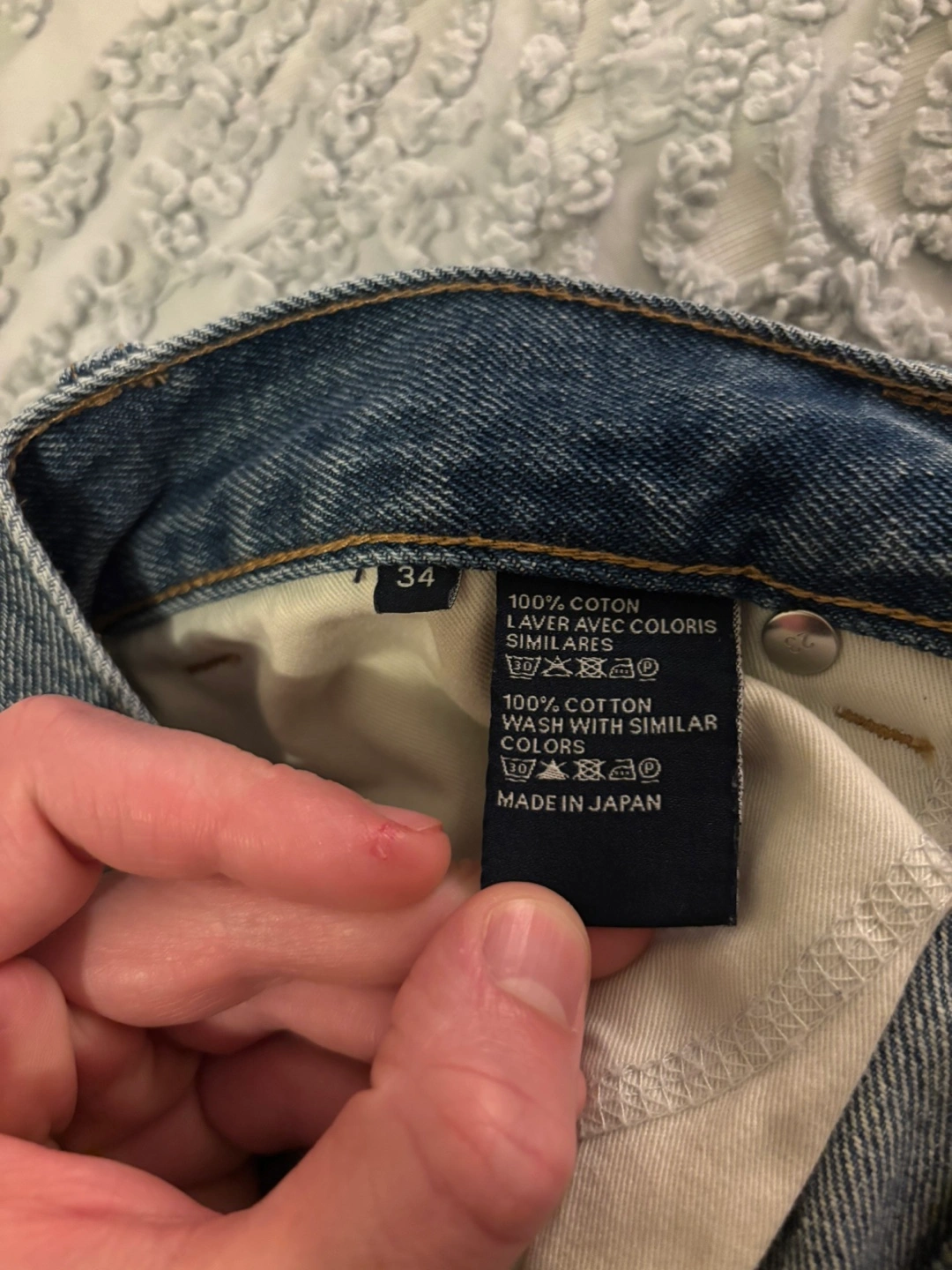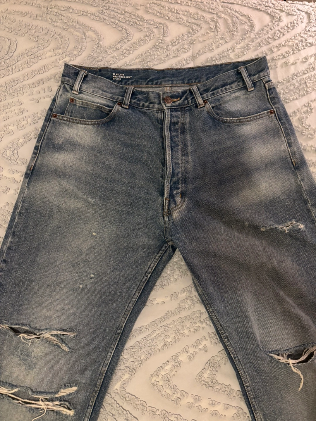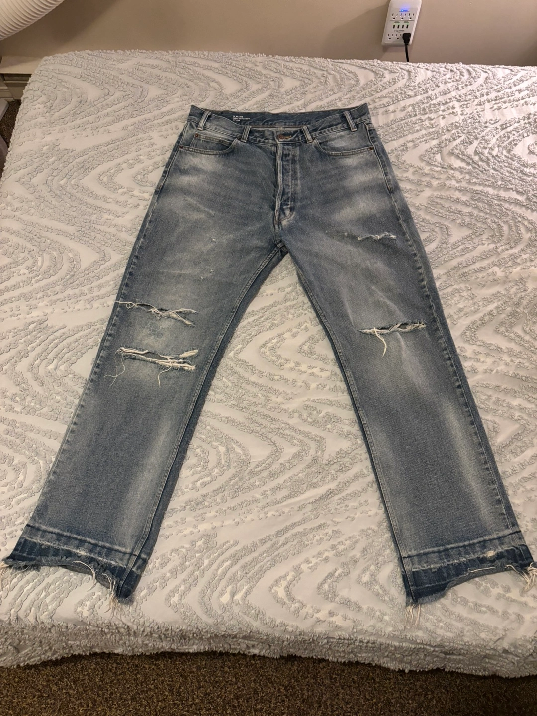 In very good condition with very minimal wear, only notable flaws if you want to call them that are the hems are slightly rolled since there are no seems and the jeans are long plus the E on the inside of jeans label looks like a F from bottom wearing off 9/10 condition overall