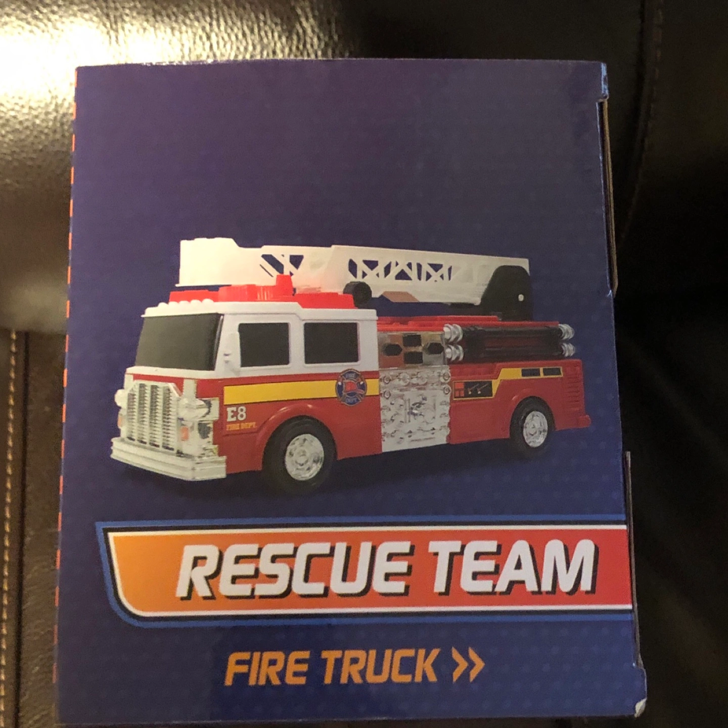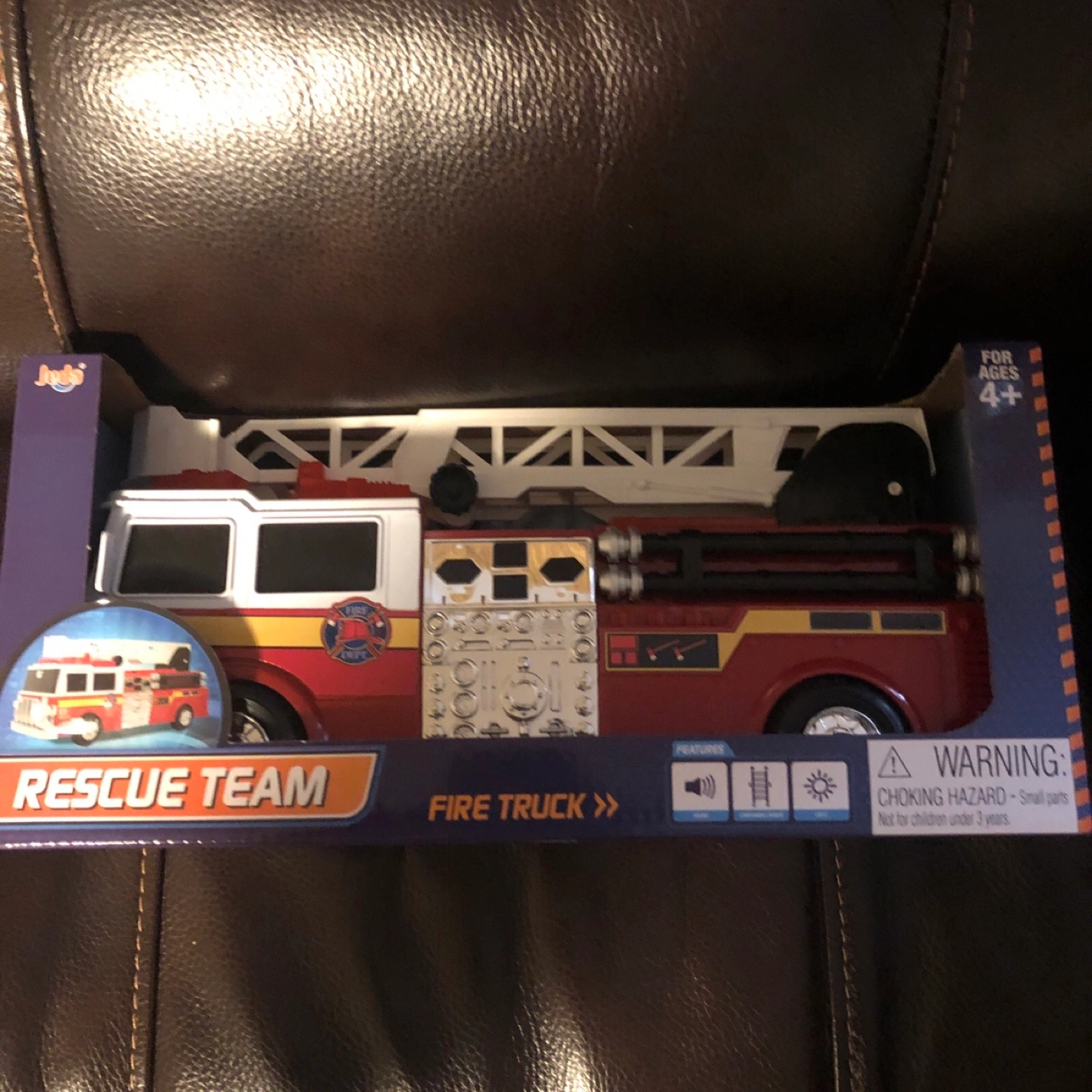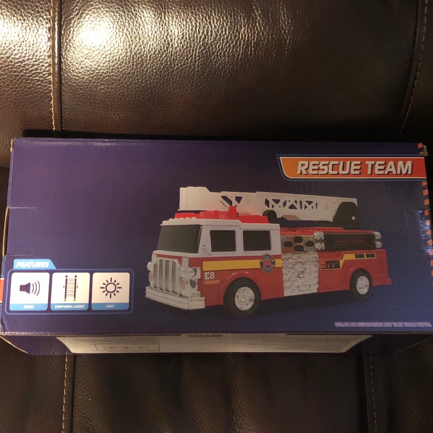 30Red firetruck toy. Features extendable ladder, lights, and sounds. Ages 4+. In box.