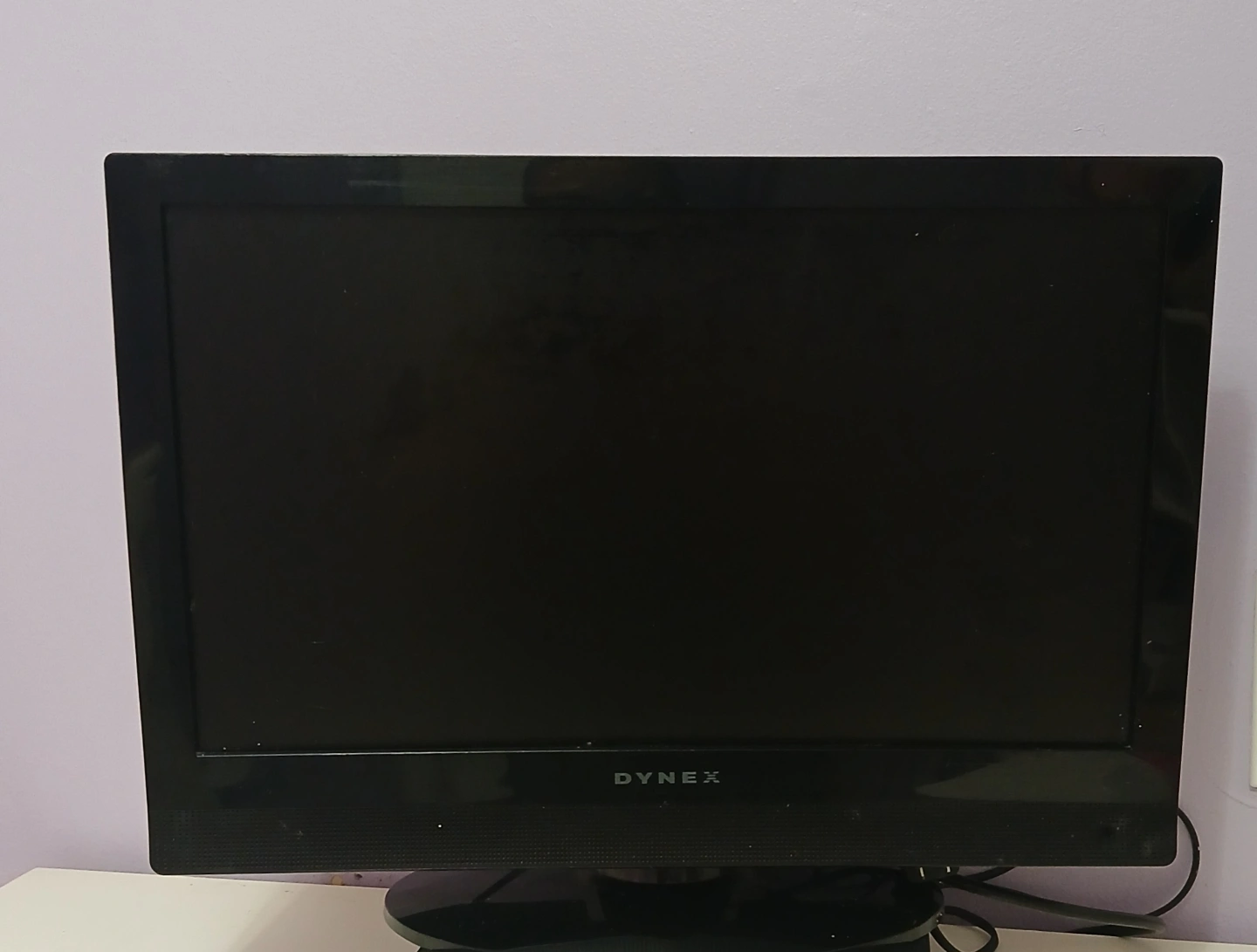 Black Dynex flat screen television/ desk top. Small size, perfect for a bedroom or small space. Does not Include power cord.