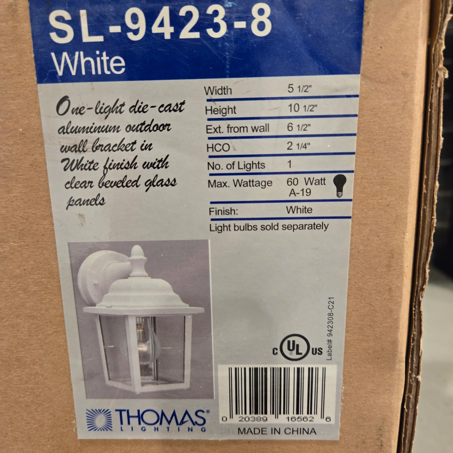 Set of two One-light die-cast aluminum outdoor wall bracket. White finish with clear beveled glass panels. Bulbs sold separately. New in box.