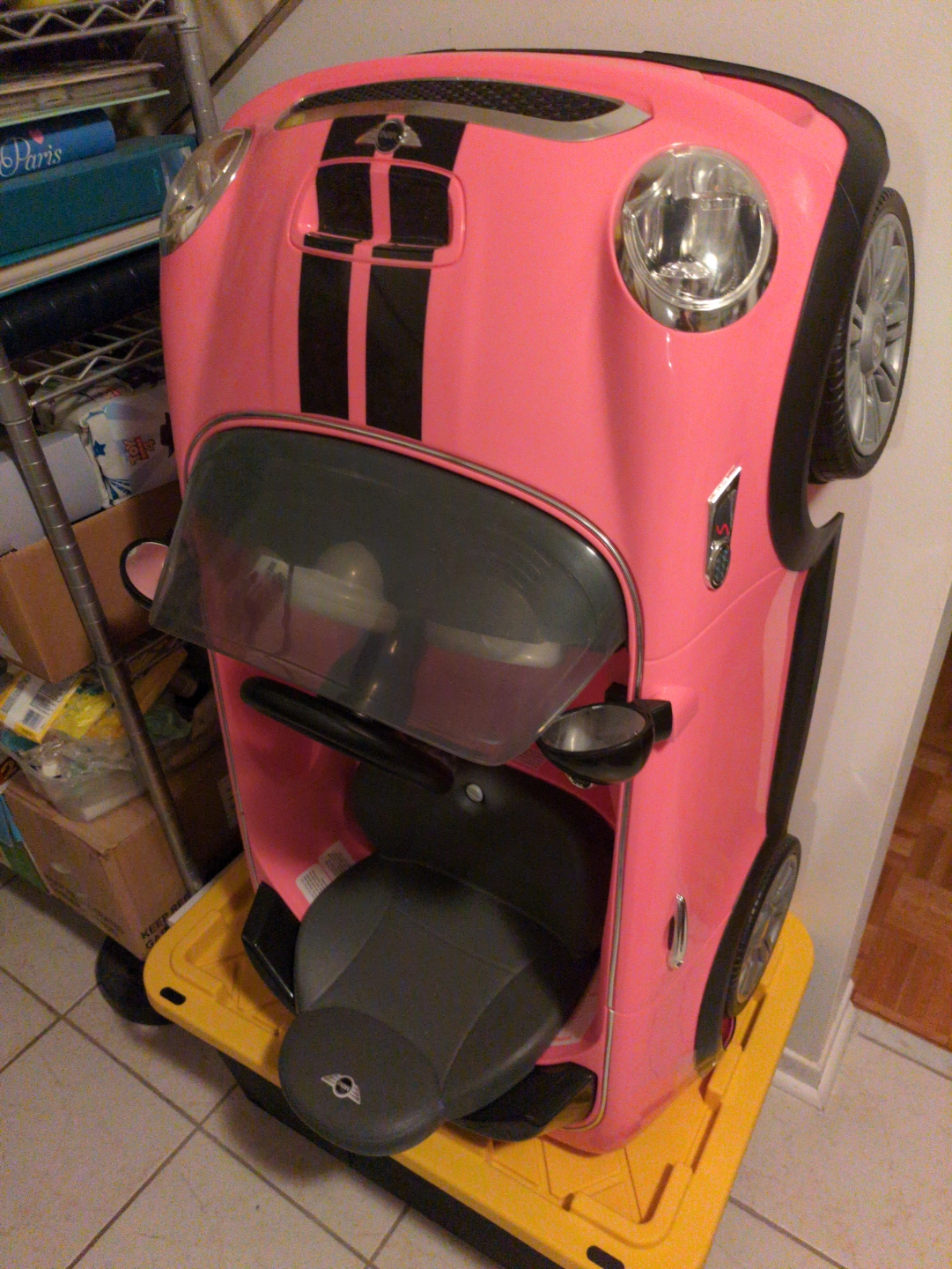 Pink children's ride-on toy car. Mini Cooper design. Features include a steering wheel and seat. Good condition.i opened it assembled it and it was never used