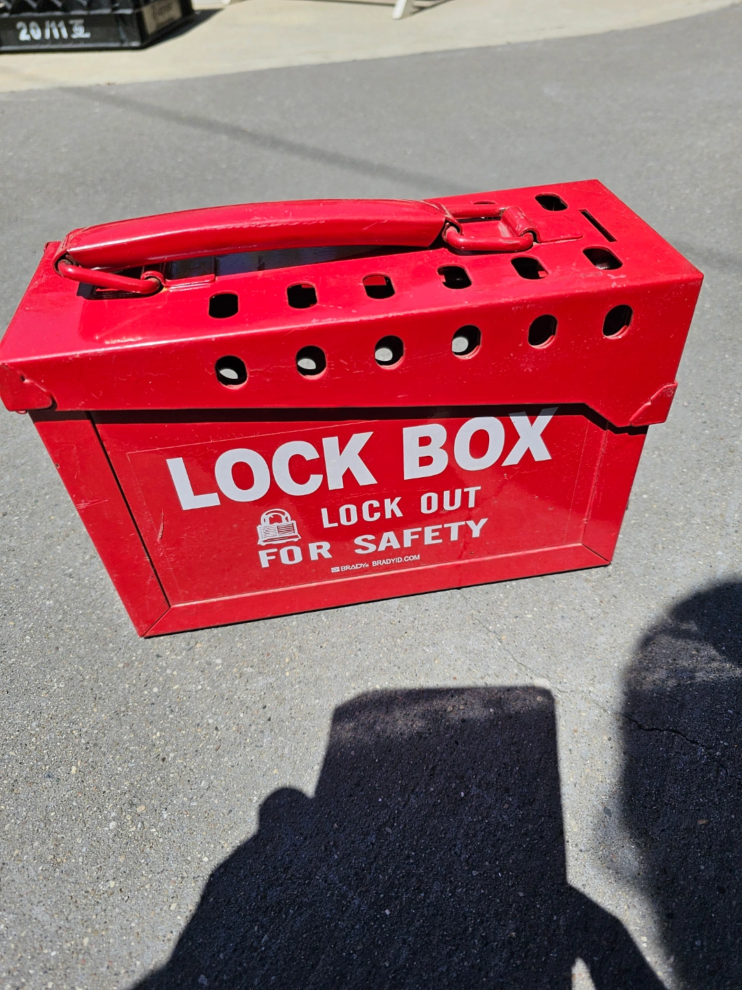 Red metal lockout box. Lockout safety. Includes multiple padlocks. Carry handle. Durable construction.