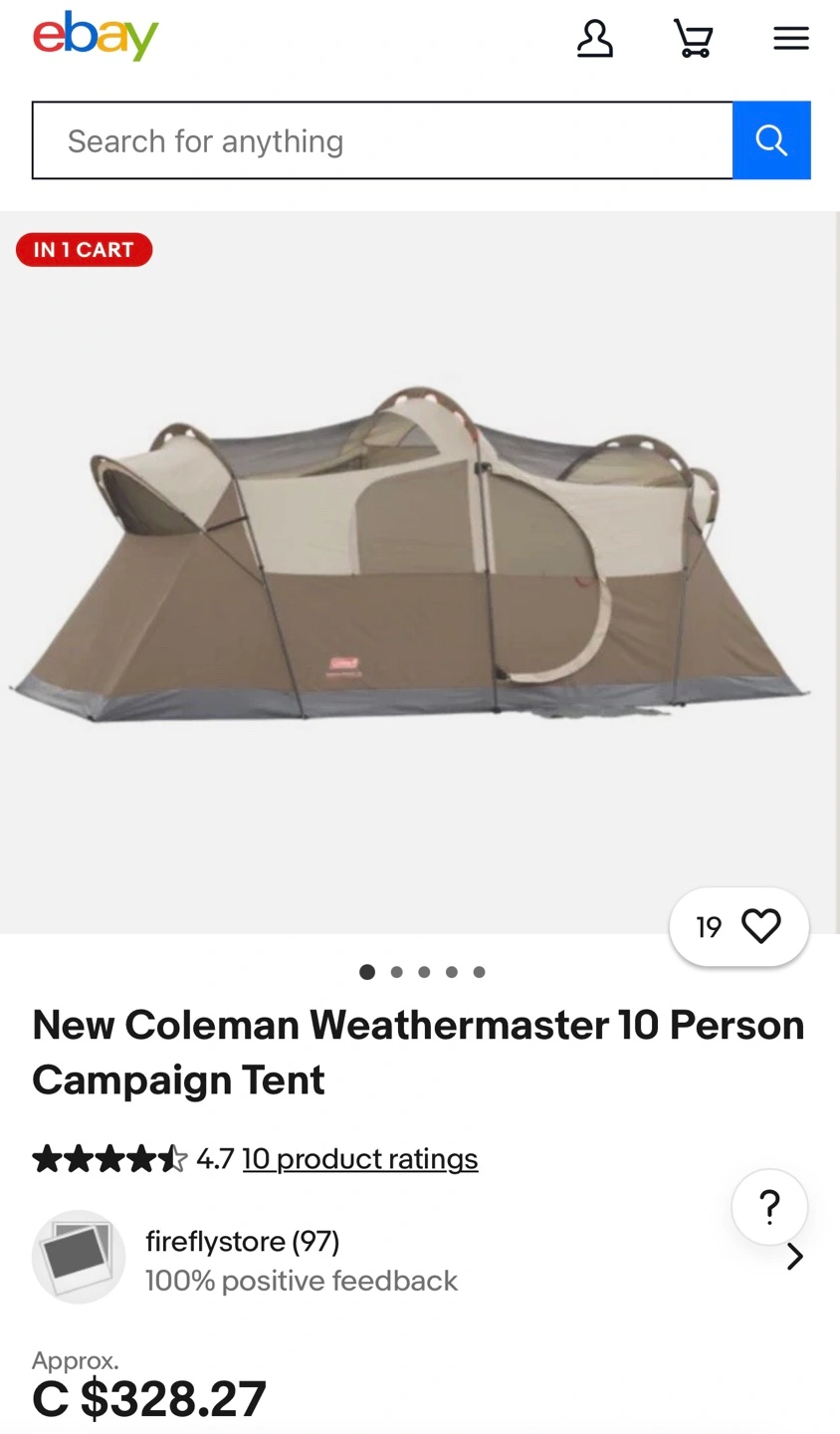 10-person tent. Sleeps 10, room to stand and move. Weathertec system. Screened porch. Converts to bedroom. Waterproof floor. Strong frame. Easy to use. EBay listing posted for price comparison.