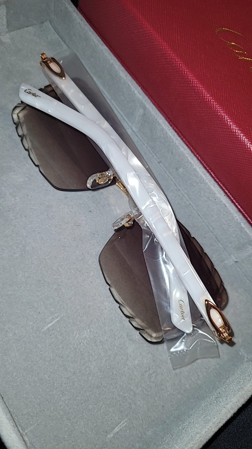 28Beautiful Cartier sunglasses. Brown gradient lenses. White acetate frame. Gold accents. Includes box and case. Like new.
