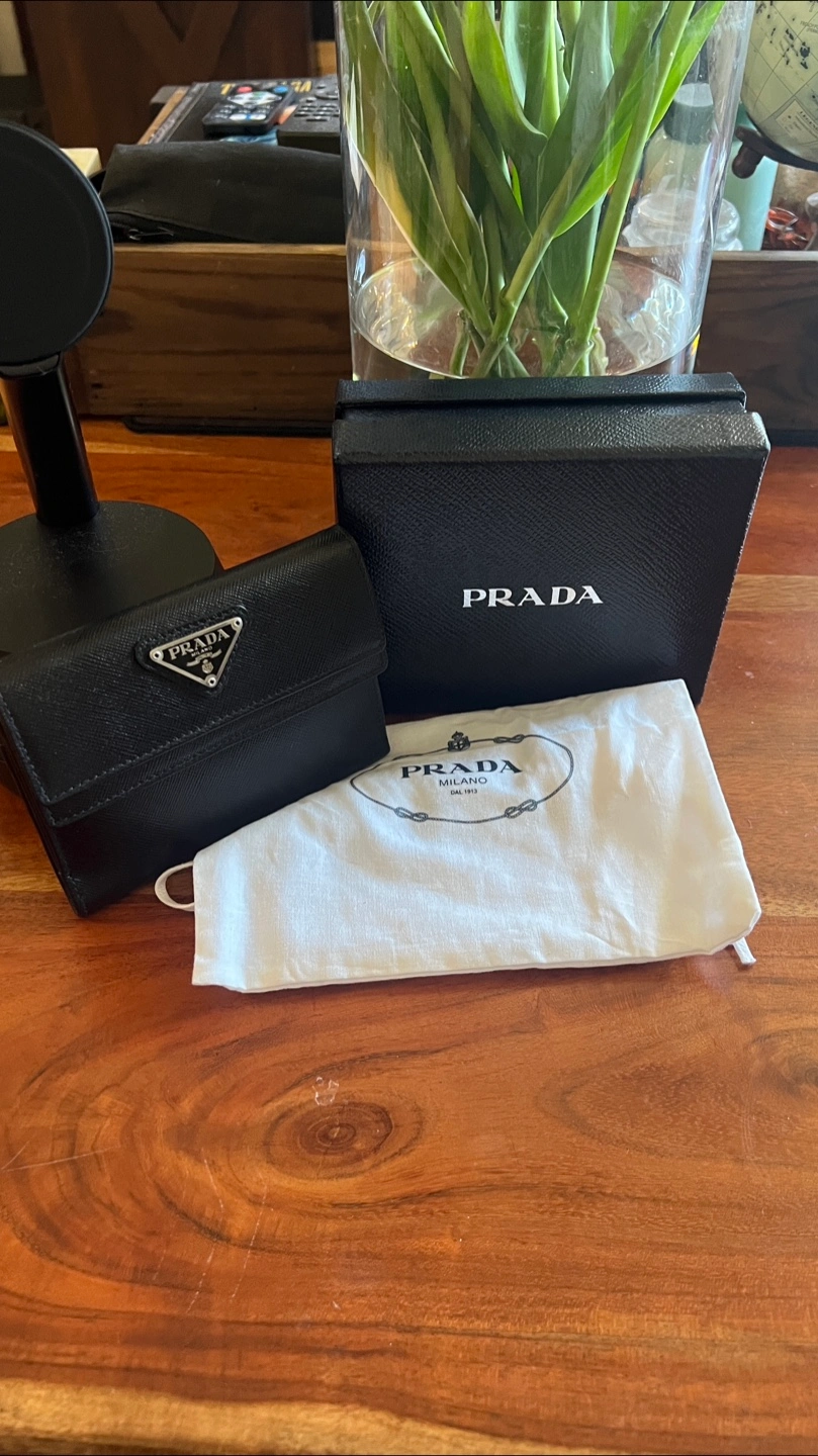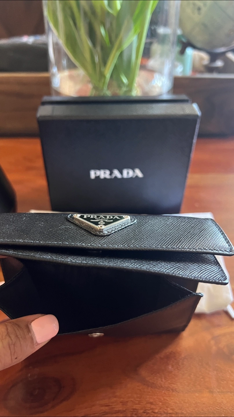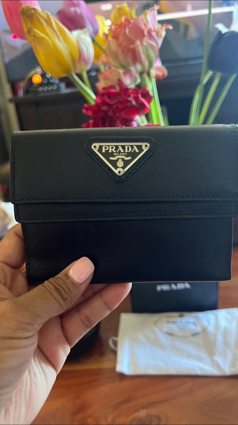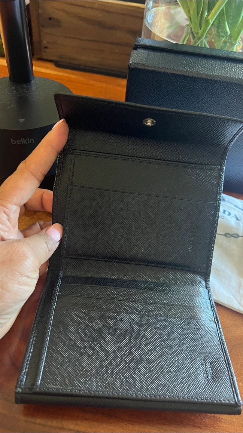 Small black Saffiano leather Prada wallet. Comes with original box and dust bag. Features a signature Prada triangle logo, 1 button closure outer pocket, 1 zipped outer pocket, 4 card slots, 1 slip pocket, 1 bill slot.