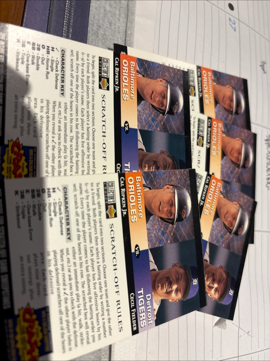 Collection of Cal Ripken Jr. scratch-off baseball cards. Features Baltimore Orioles vs Detroit Tigers and Oakland Athletics vs California Angels. Includes team roster and game play instructions.