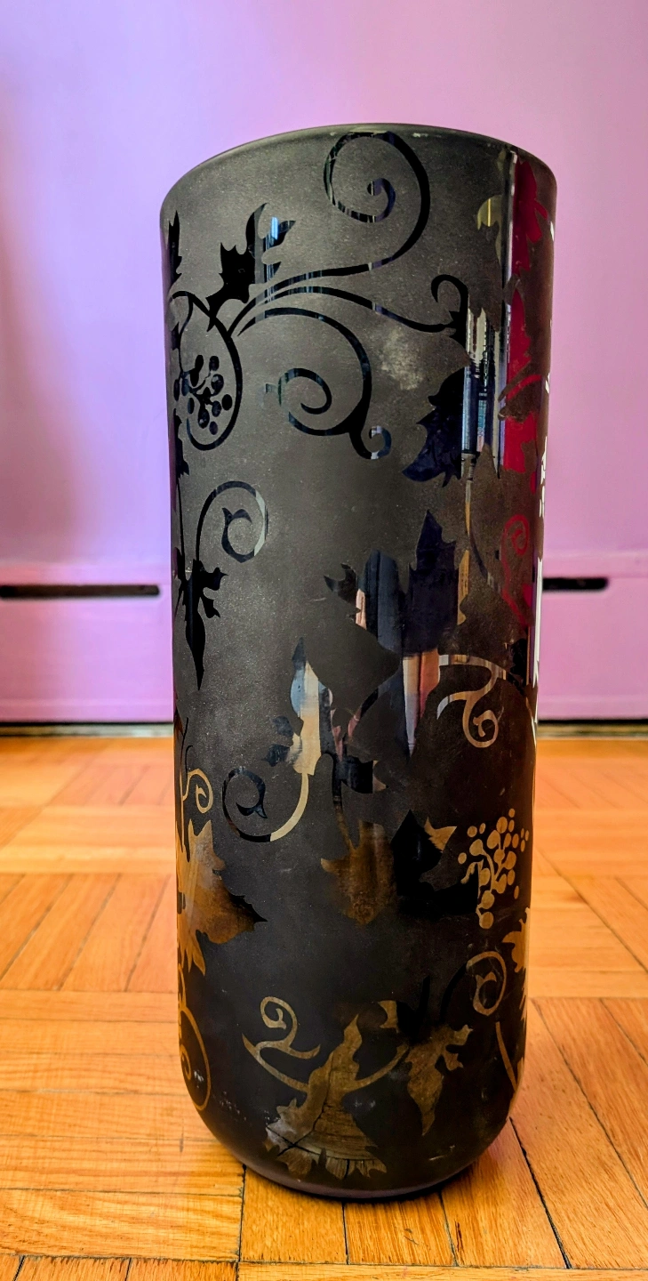 Tall cylindrical glass vase. Features a frosted black finish and an etched leaf pattern. Perfect for a modern or eclectic decor.