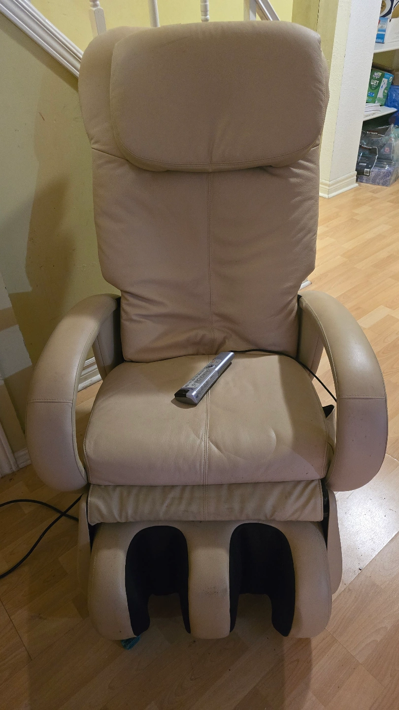 Lowered price for a quick sale. Tan coloured massage chair. Features include reclining function and foot massage. Includes remote control. Leg massage function stopped working and not sure why, but everything else works perfectly. is a Tab reclining massage chair, perfect for relaxing after a long day! $50 obo and must be able to pick it up and move it.