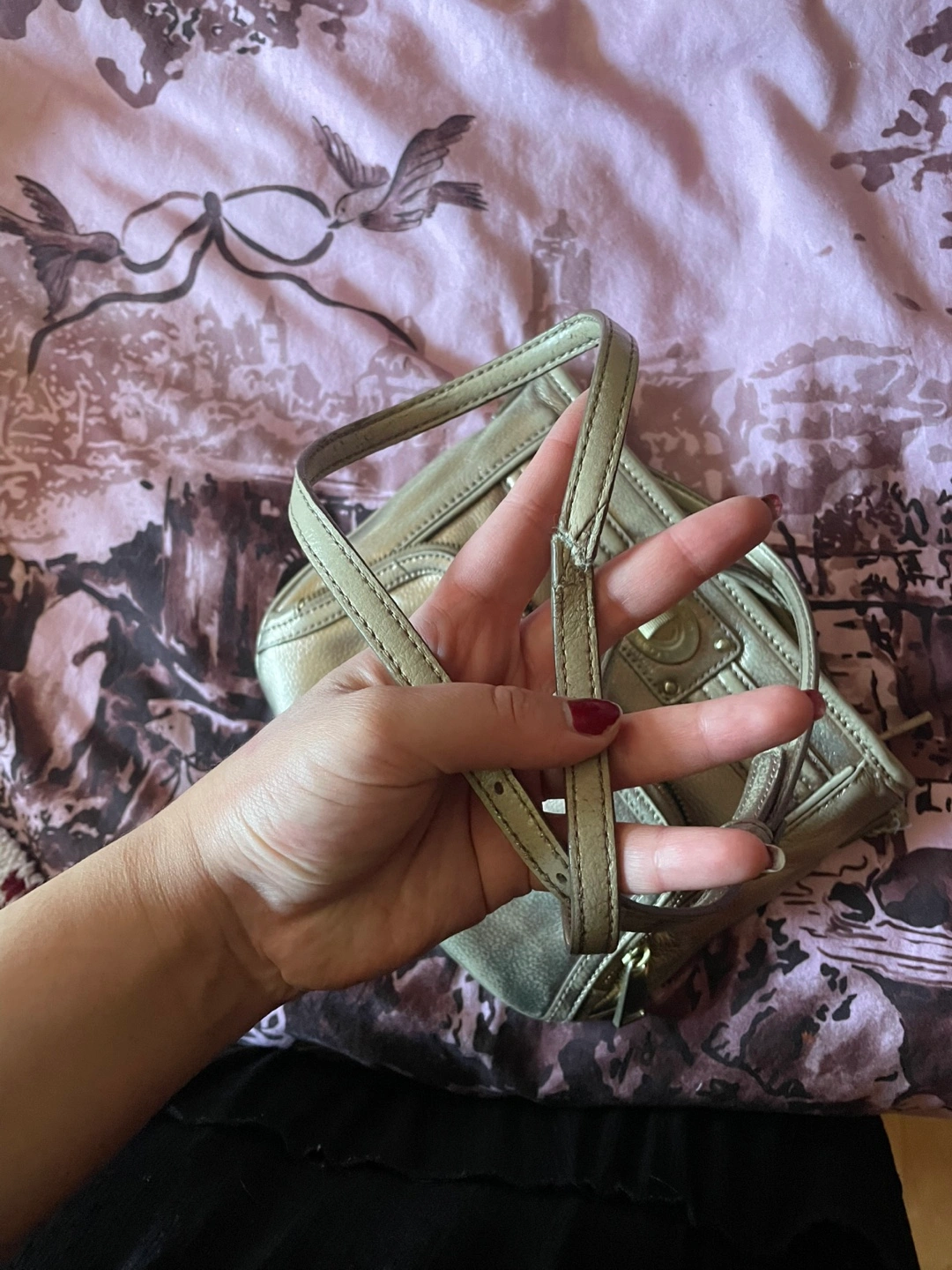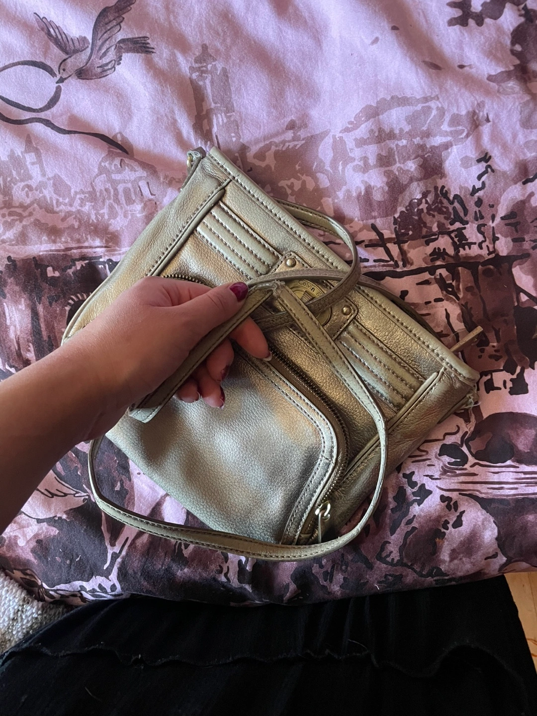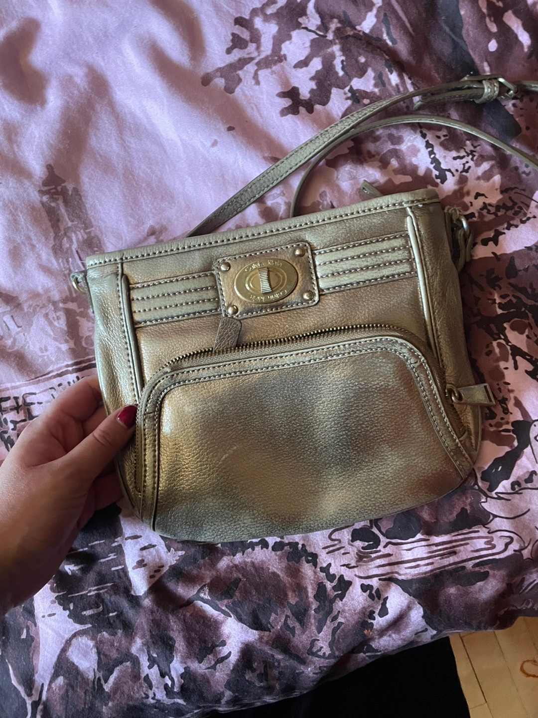 Metallic gold crossbody bag. Features multiple pockets and a long adjustable strap, shoes wear. Zipper closure.