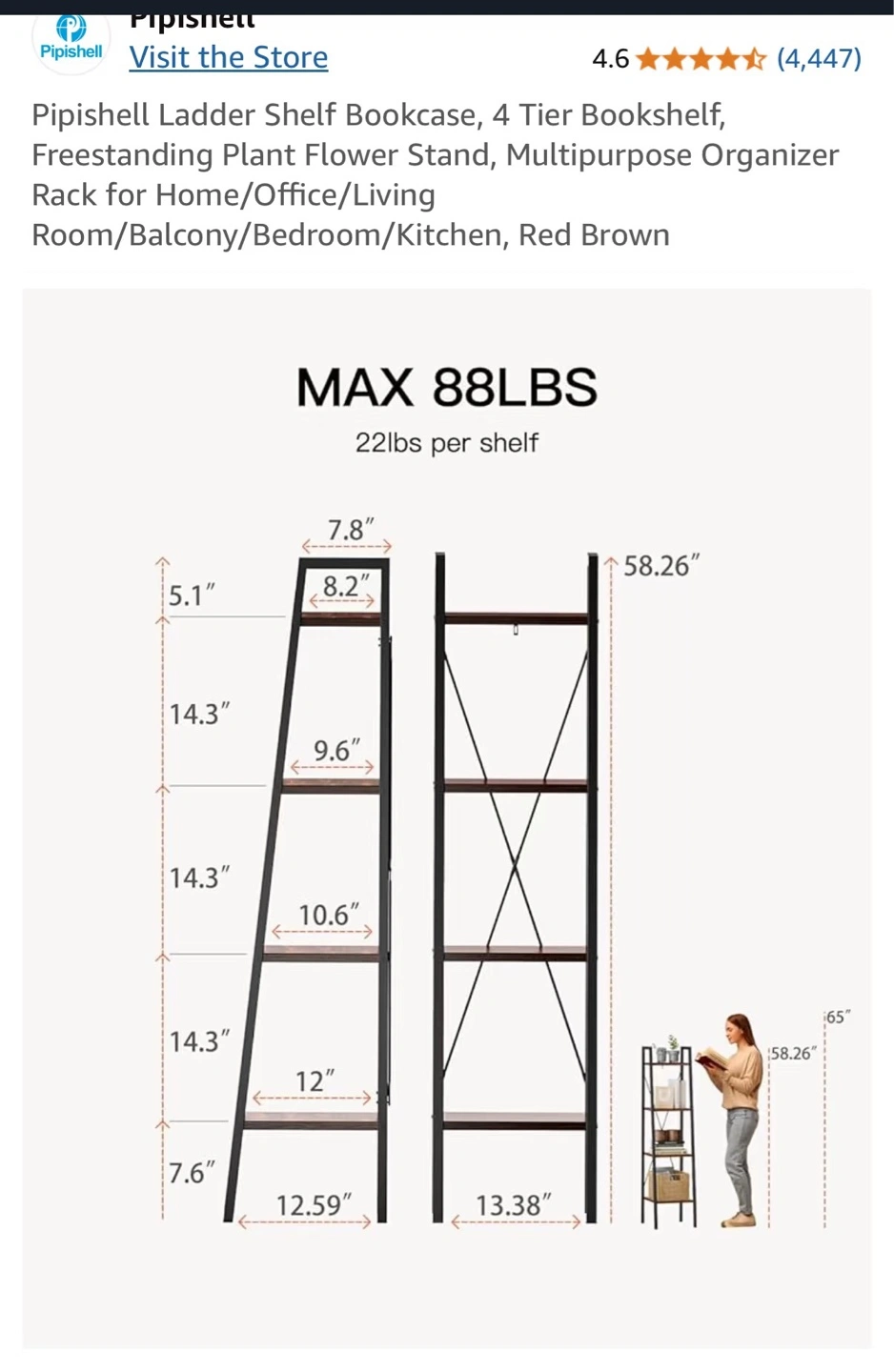 4-tier bookshelf, freestanding plant stand. Multipurpose organizer rack for home, office, living room, balcony, or bedroom. Red brown color. Max weight 88 lbs.