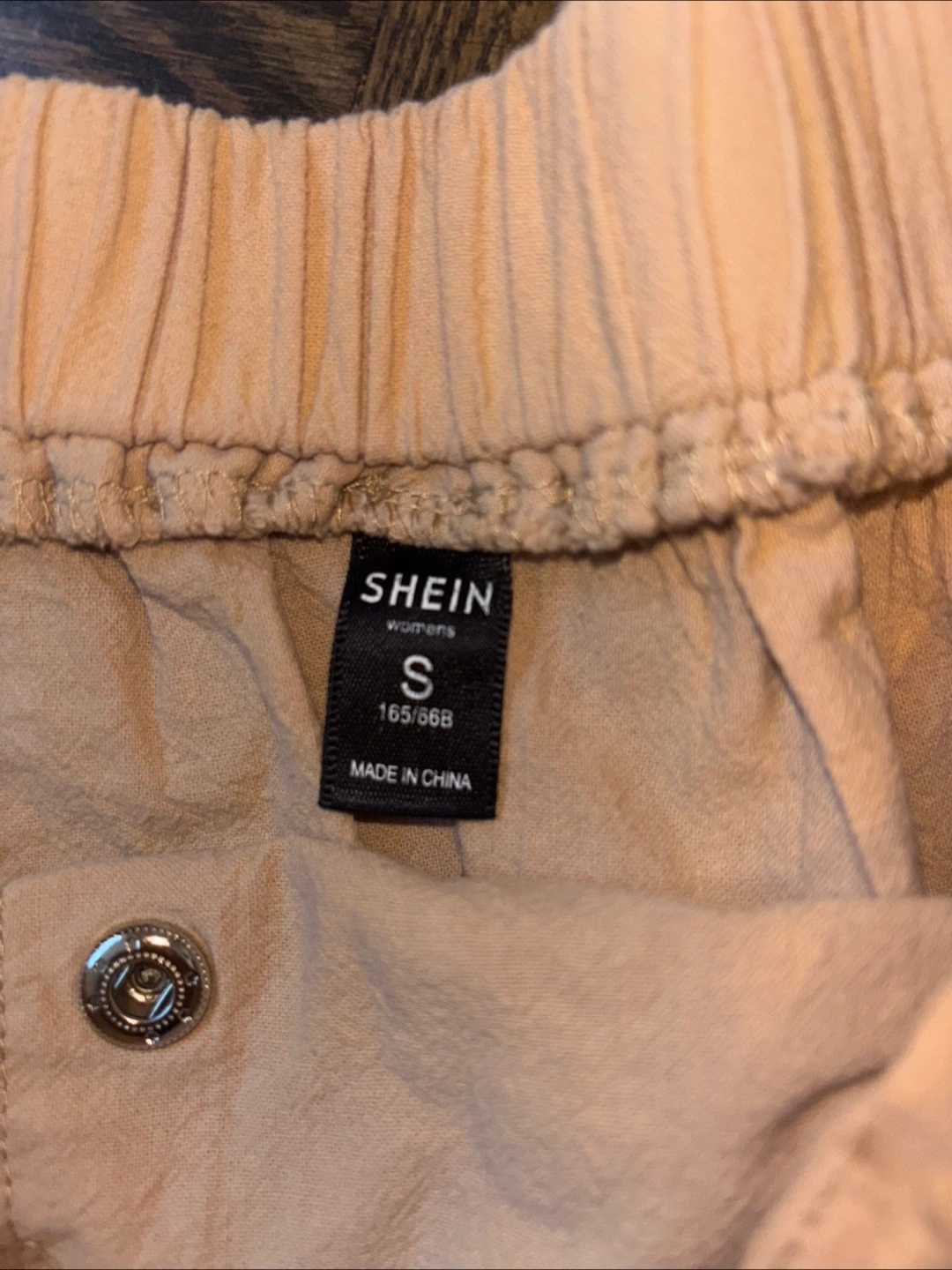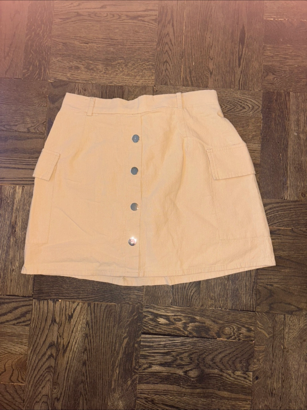 Cute mini skirt. Beige color. Size small. Elastic waistband. Button closure. Two cargo pockets