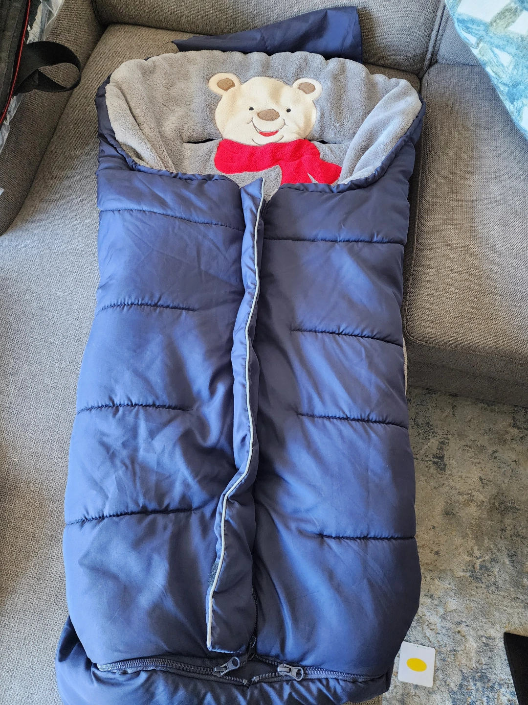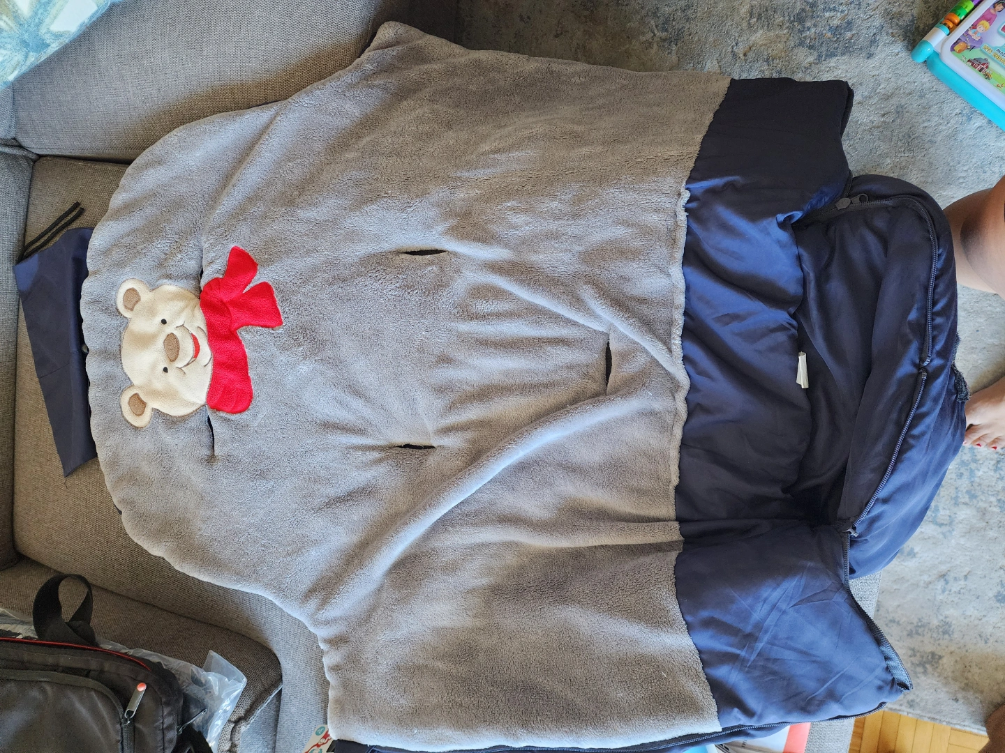 Cozy baby sleeping bag, quilted design, navy blue exterior, grey plush teddy bear hood with red scarf detail. Zipper closure. Suitable for strollers or car seats.