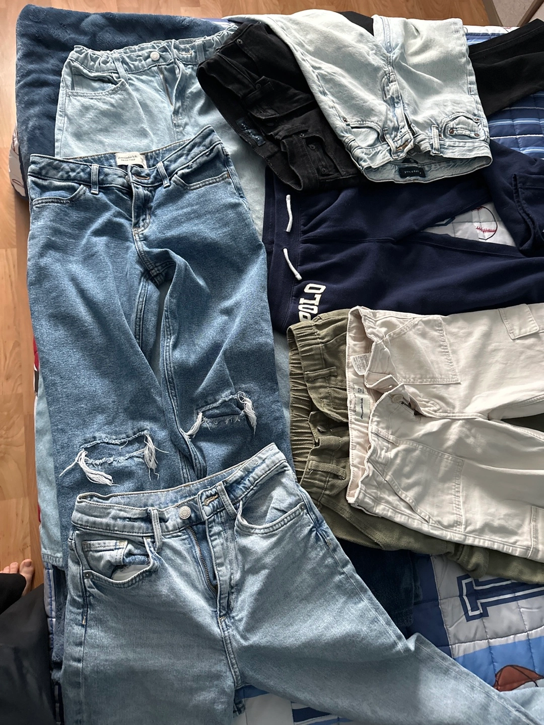 Large bundle of jeans and pants. Different washes and styles. For girls, size 12-14. Gently worn,very good condition. Abercrombie kids, H&M, Aeropostale.