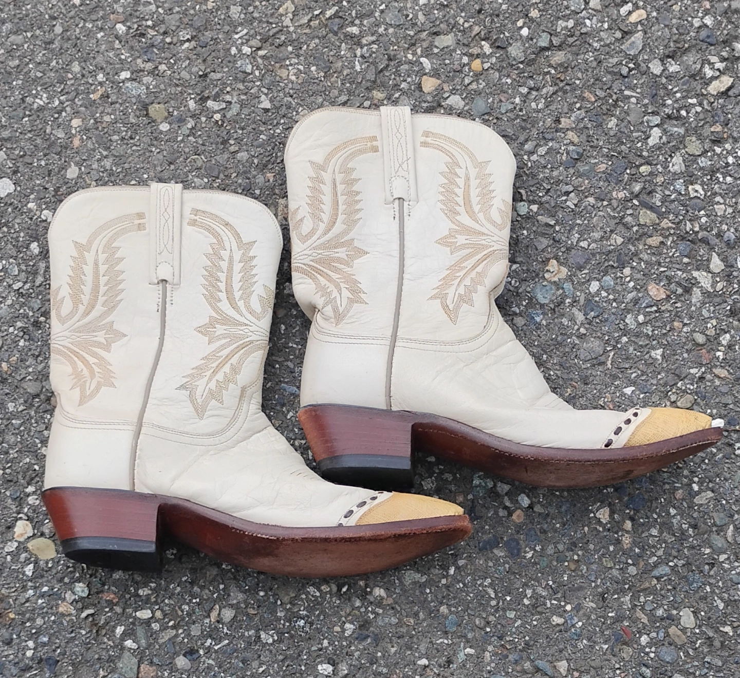 Pair of off-white leather cowboy boots. Brown leather heels. Intricate stitching detail. Pointed toes with contrasting yellow leather accents.