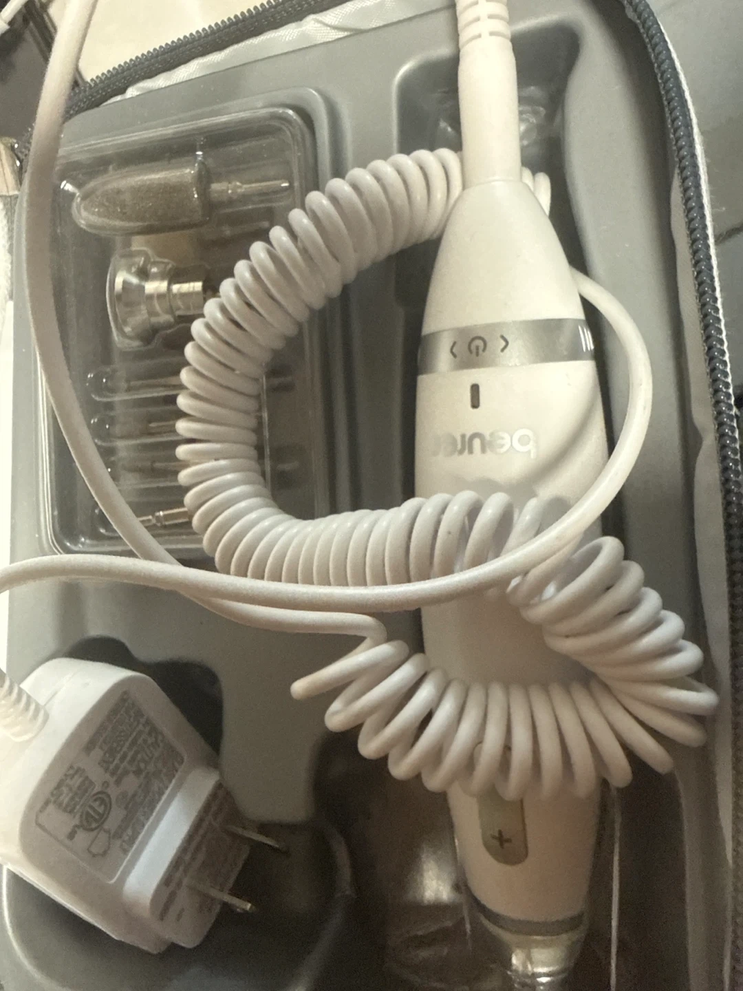 This Beurer manicure and pedicure set comes with multiple attachments. It includes a charging adapter and storage case. This set is great for at-home nail care!
