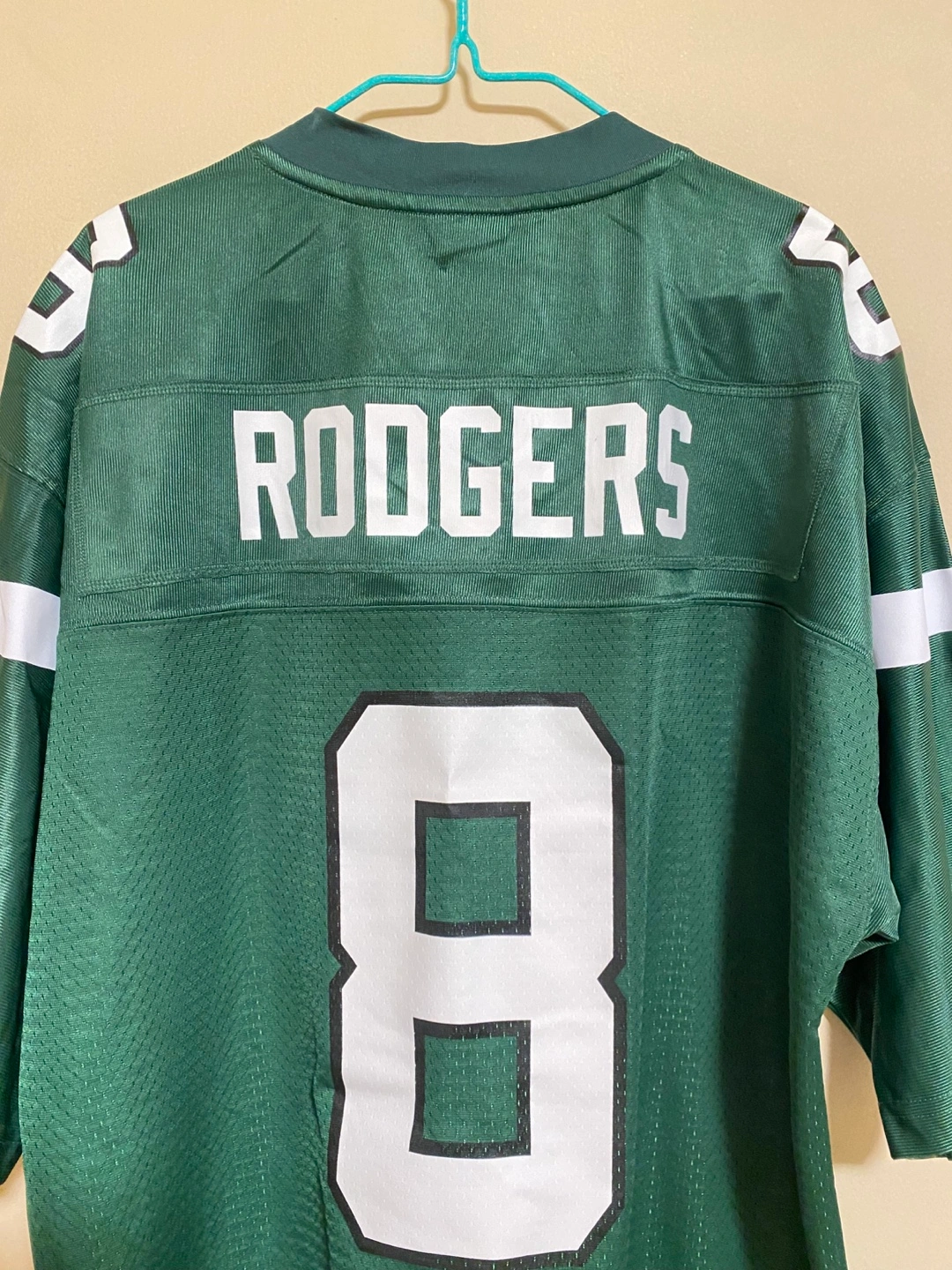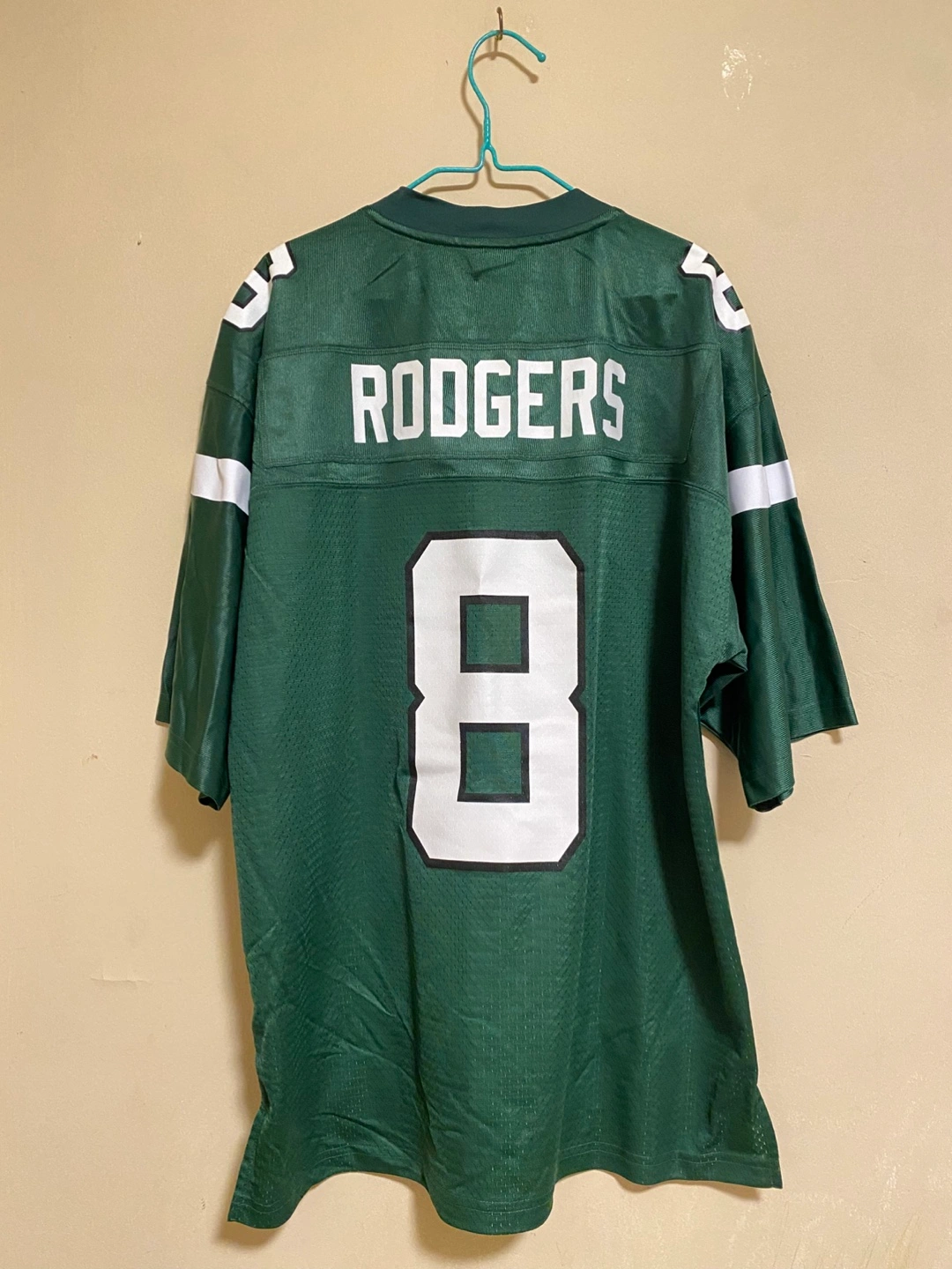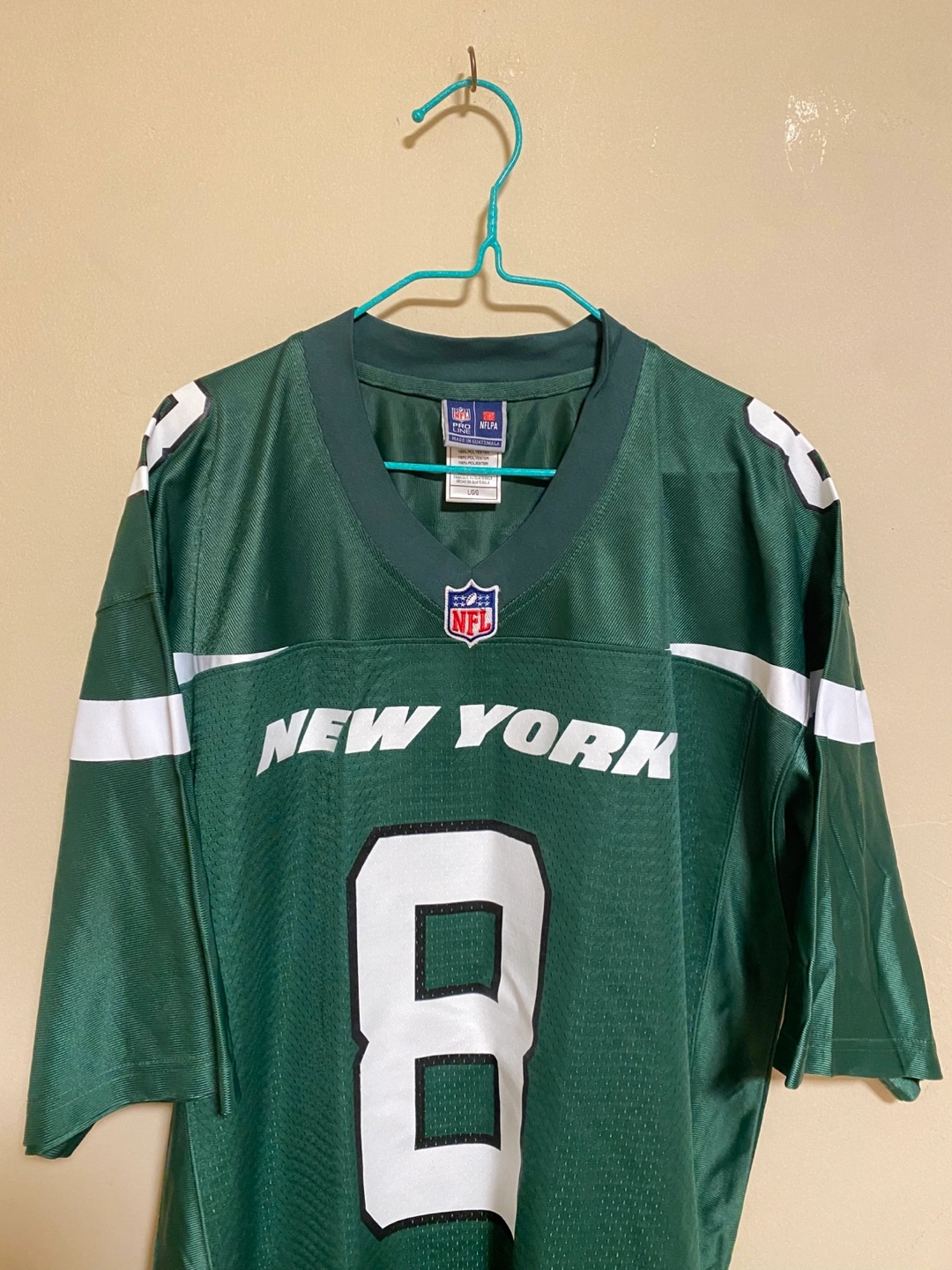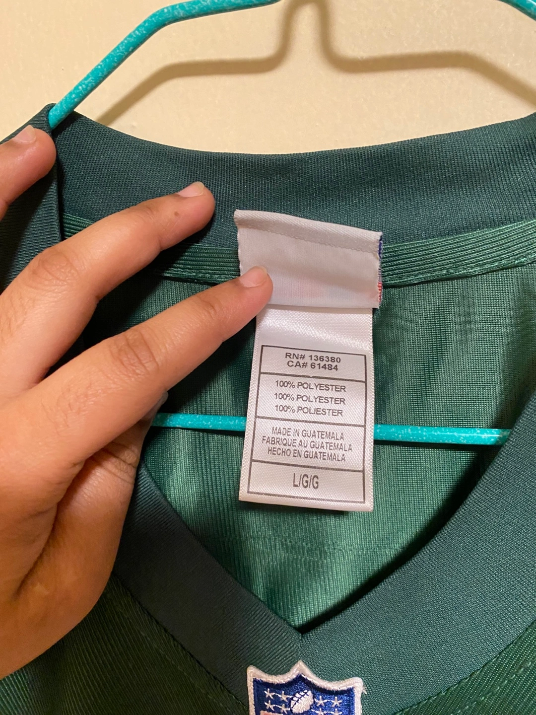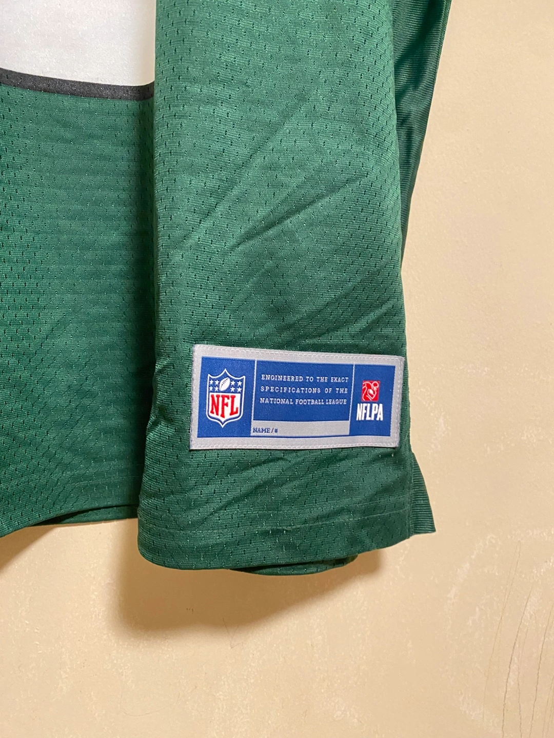 Men's size Large green New York Jets jersey. Features player name and number. NFL and NFLPA tags. Made in Guatemala. 100% polyester.