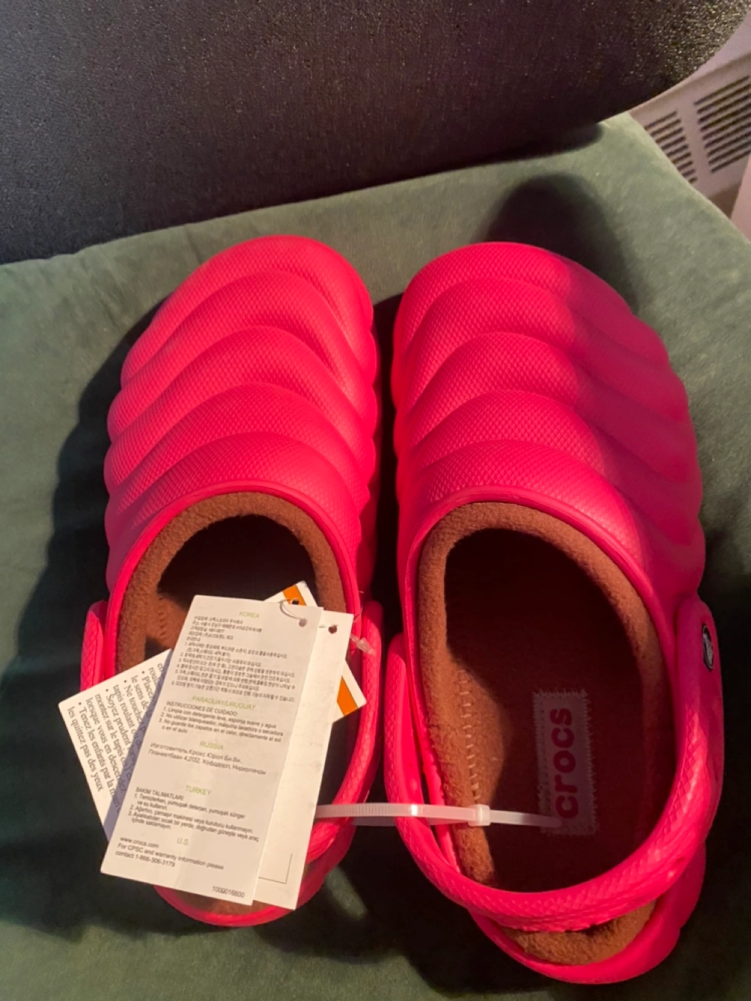Pink Crocs Classic Lined Overpuff clogs. Women's size 8. Brown fuzzy lining.