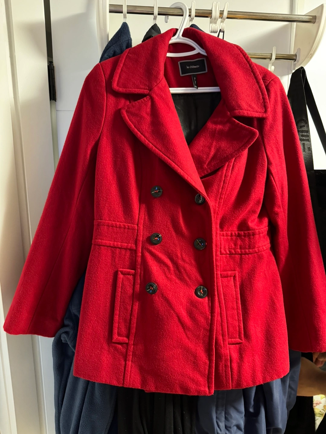 Women's red peacoat. Double-breasted. Size medium. Features a notched collar and button closures. Classic style, great for colder weather.