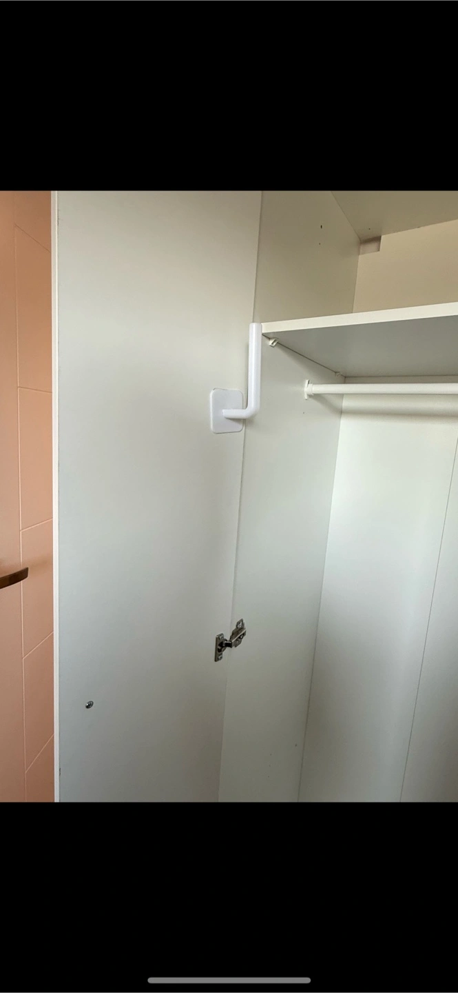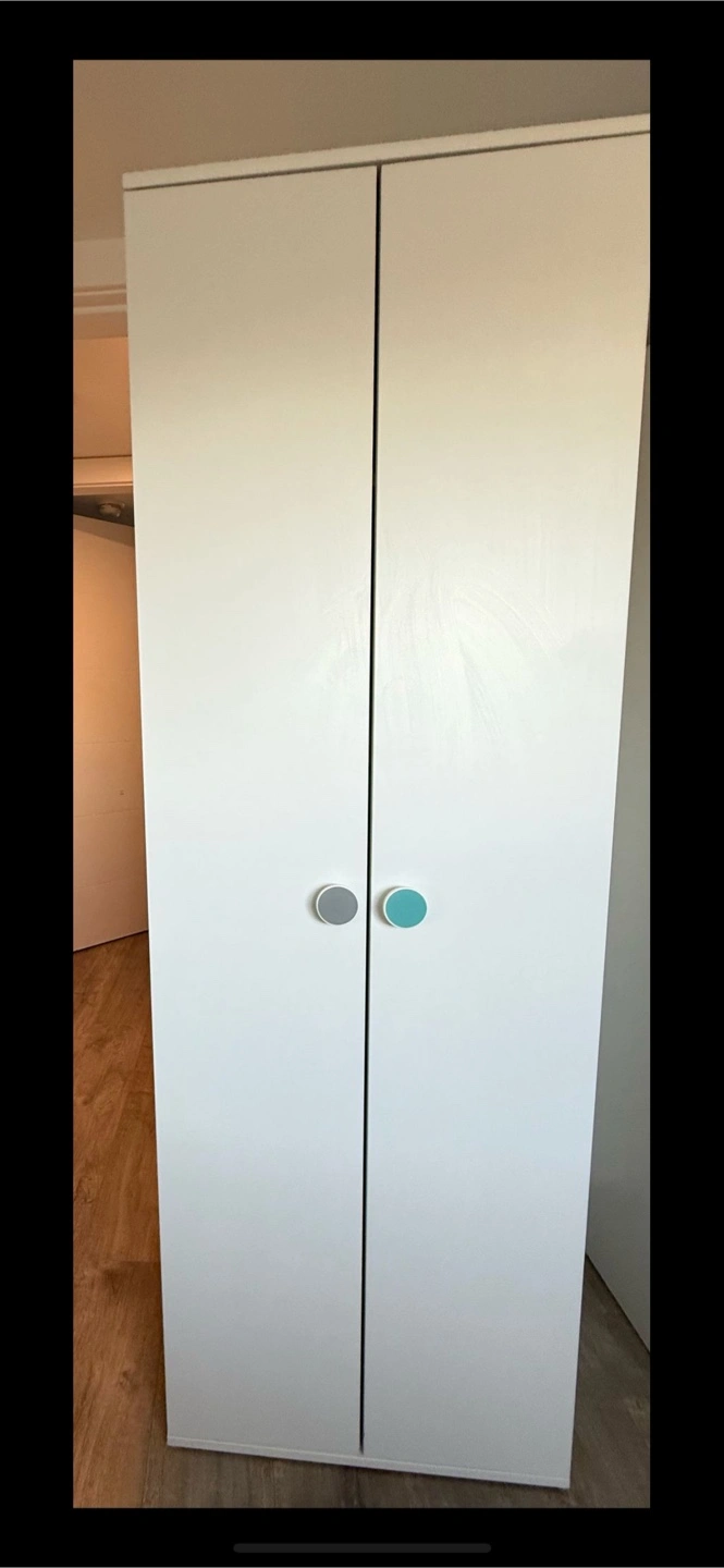 Tall Ikea white wardrobe. Two doors, one shelf, and a hanging rod. Simple design. Great for bedroom storage.