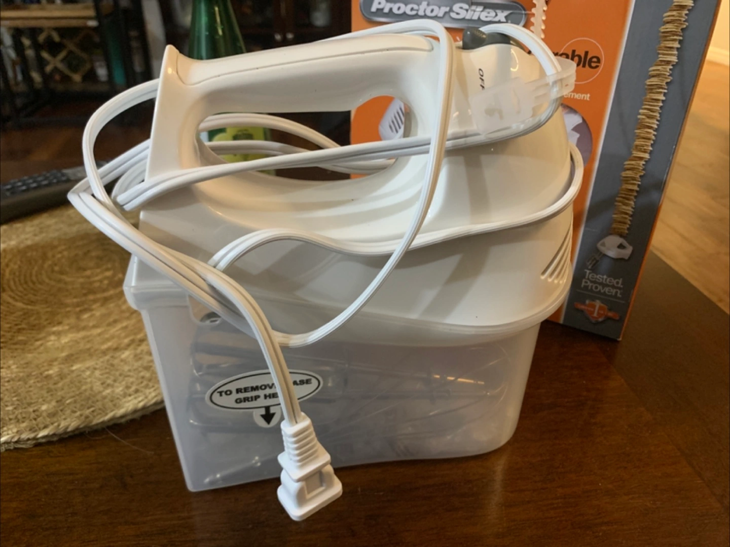 White hand mixer. 150 watts. Five speeds. Durable chrome beaters. Snap-on storage case. Tested for durability and reliability.
