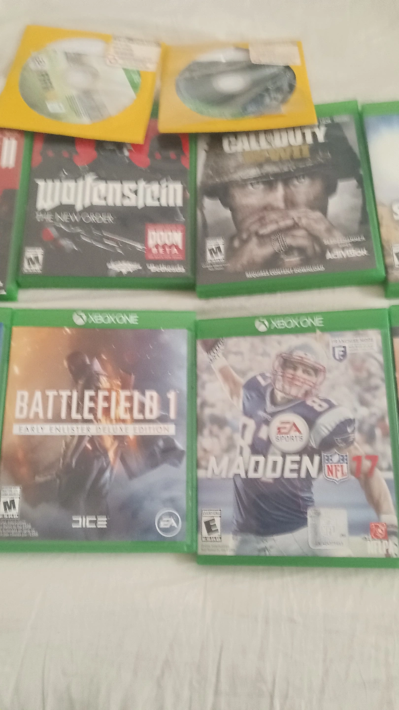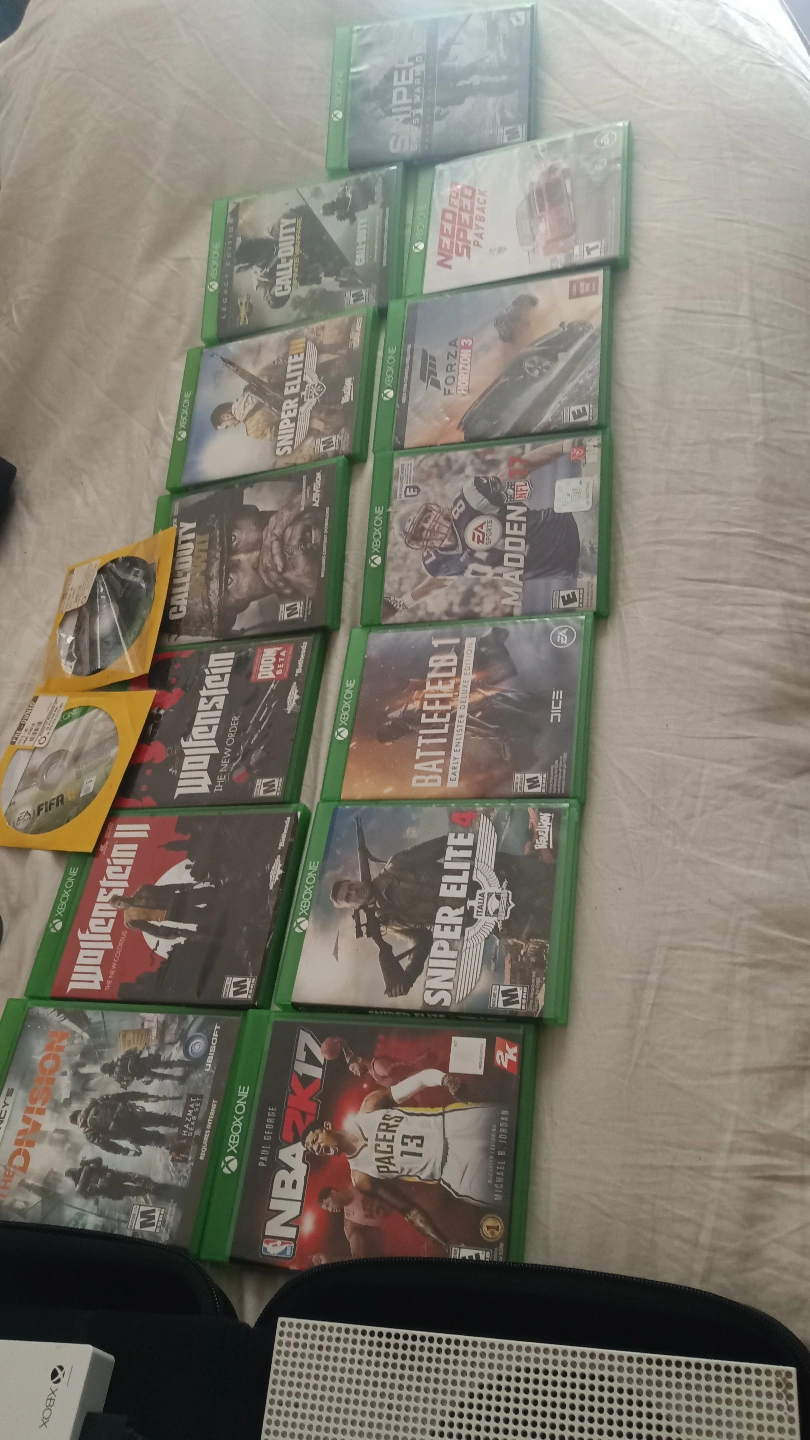 White Xbox One console. Includes controller, carrying case, and power supply. External hard drive. Many games included: Call of Duty, Battlefield, Madden, NBA 2K, Forza, Need for Speed, Sniper Elite, Wolfenstein, and The Division. Check pictures for specific titles.