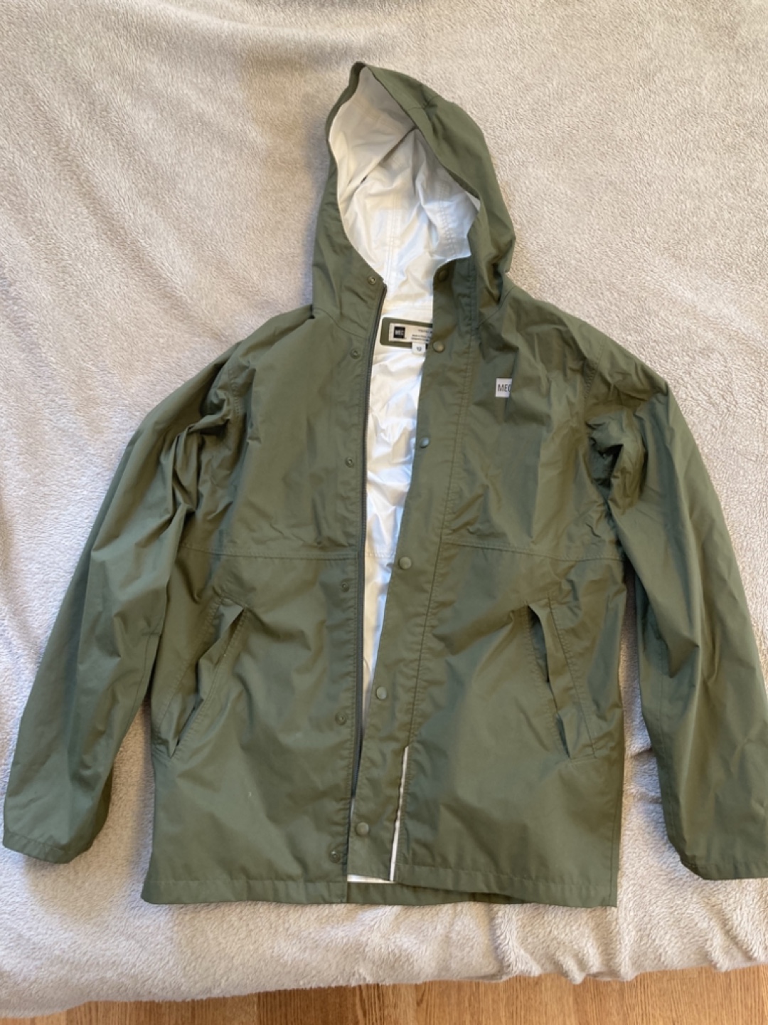 Olive green youth rain jacket. Size 12. Hood with white lining. Snap and zipper closure. Two front pockets. Designed in Canada.