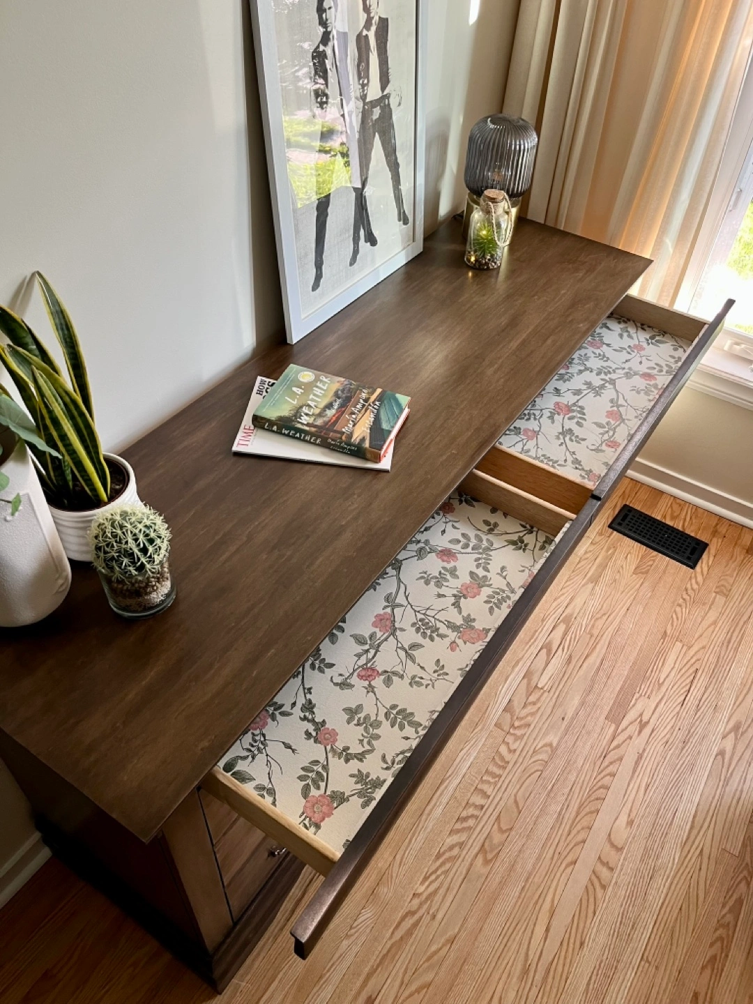 There is ample amount of storage with the 6 deep drawers in this large dresser. Each drawer has a stopper to avoid pulling it out too far. The best part is the 2 hidden drawers at the top line with vintage floral paper! I didn’t even realize they were drawers at first. Some drawers have a bit of discolouration on inside.