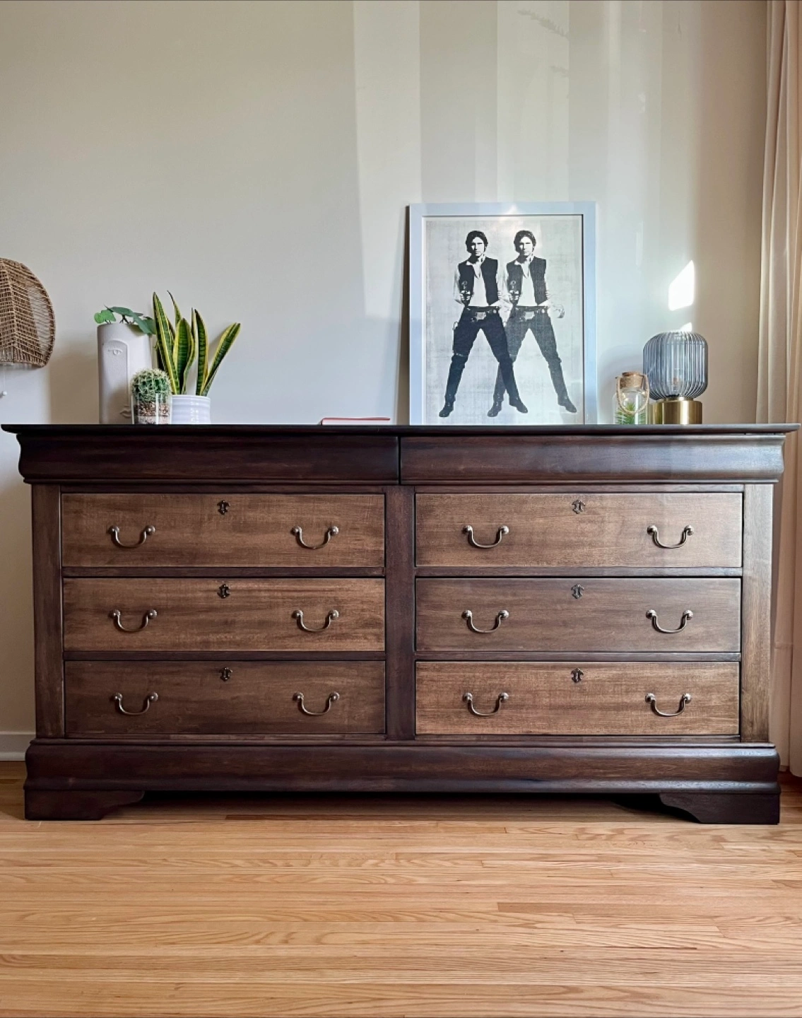 Dresser was completely sanded down and stained multiple coats to create this custom dark java colour. New handles were added to the drawer fronts and entire piece was coated in multiple top coats for durability. Inside drawers were coated in wood conditioner and top 2 small drawers have floral paper.
