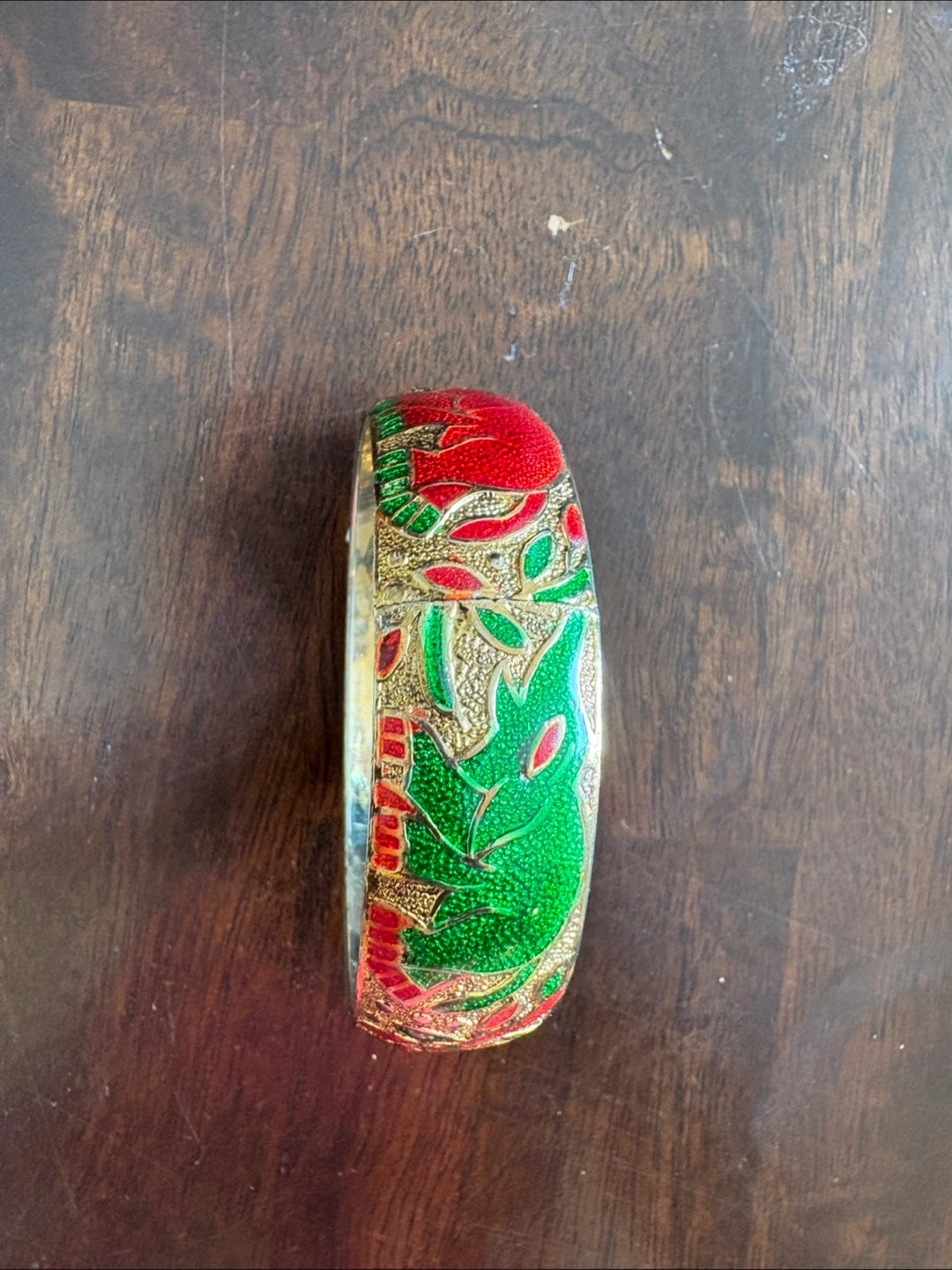 Vintage metal bangle bracelet. Features a red and green enamel floral design. Unique statement piece. Lightweight and comfortable to wear.