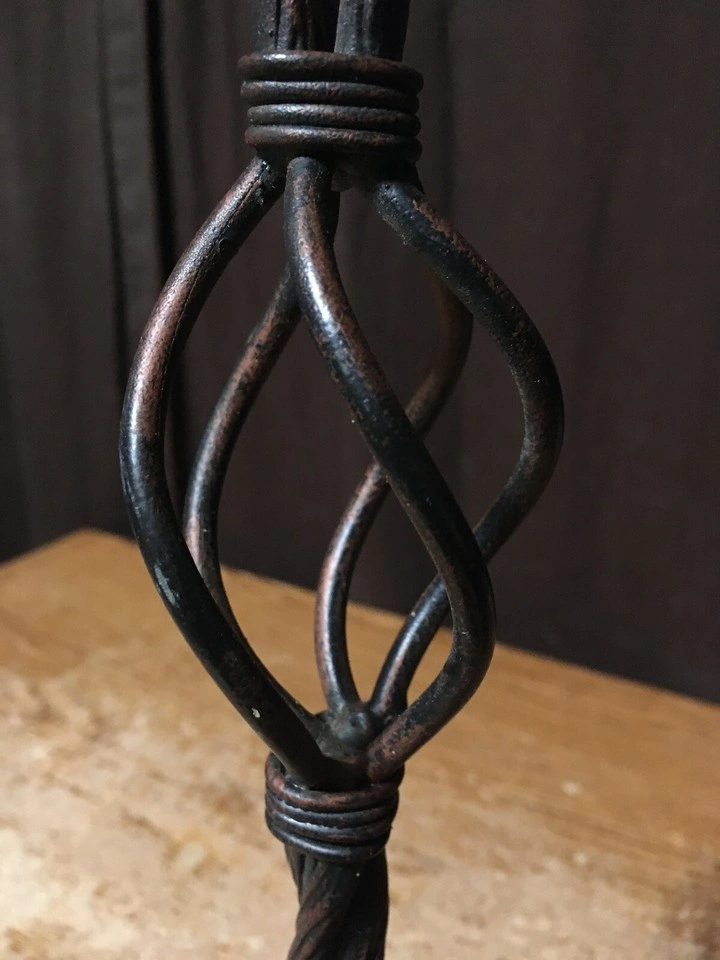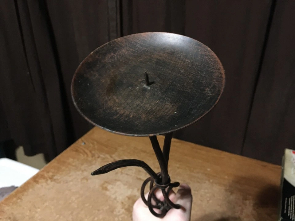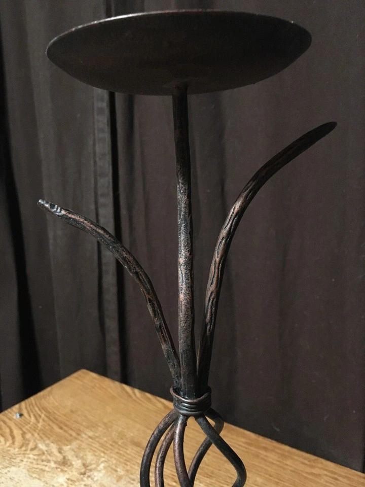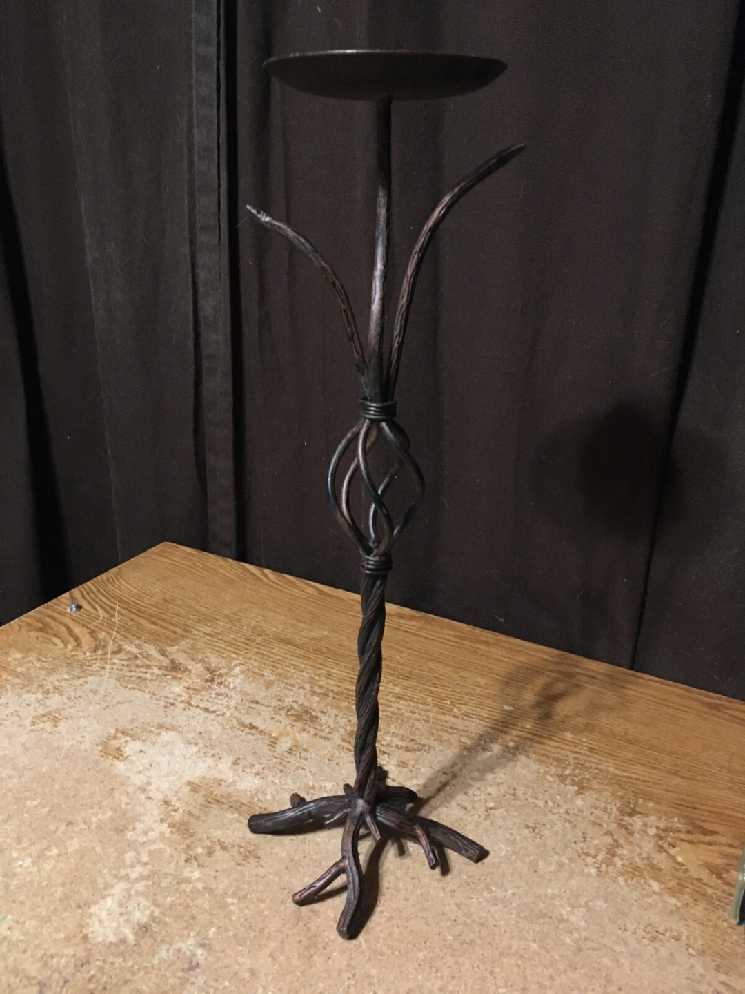 Ornate metal candle holder. Features a twisted stem and branched base. Dark brown finish. Perfect for adding rustic charm to your home decor. Great condition 18 in tall. pick up at house