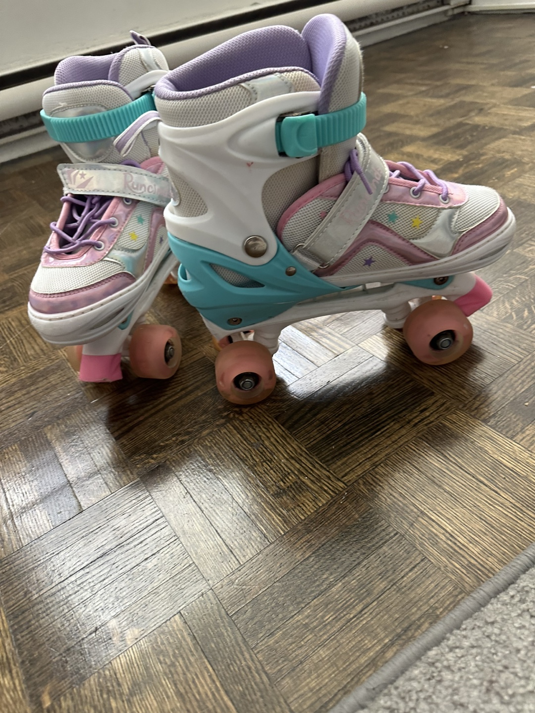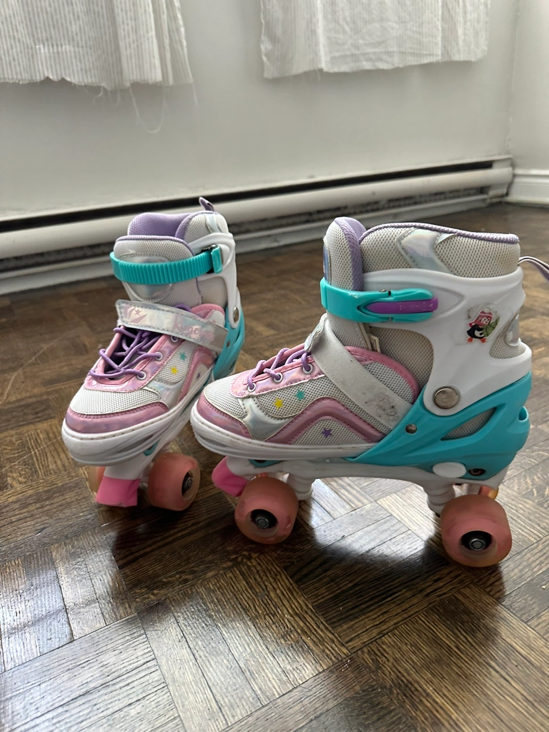 Pink, white and teal girls' adjustable roller skates. Suitable for young children. Features laces and a strap.