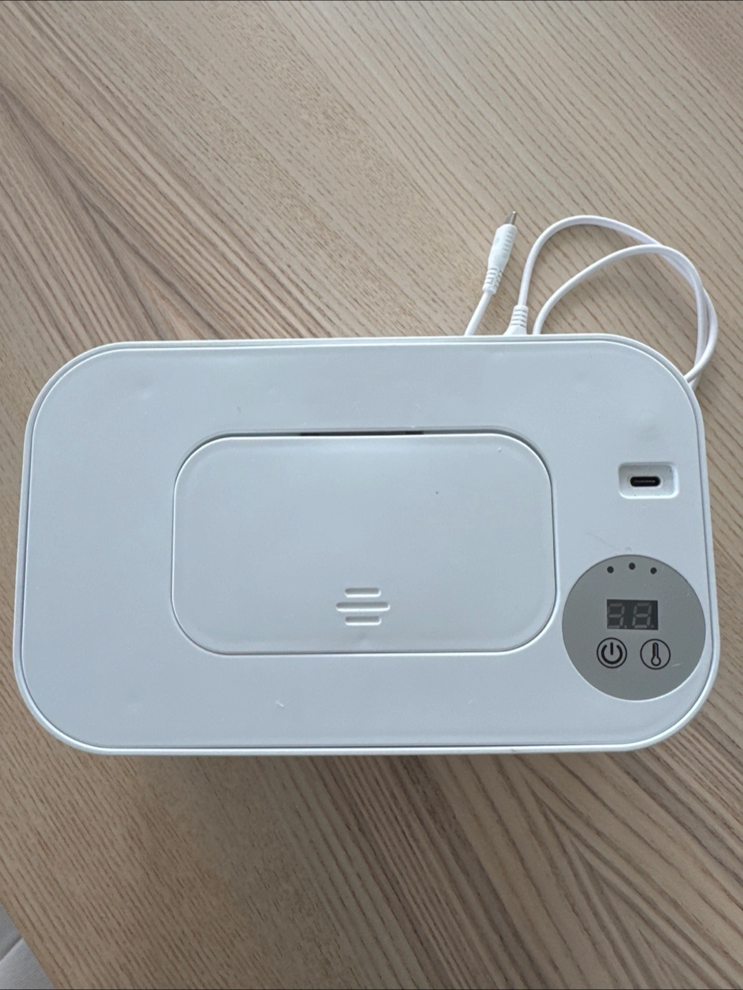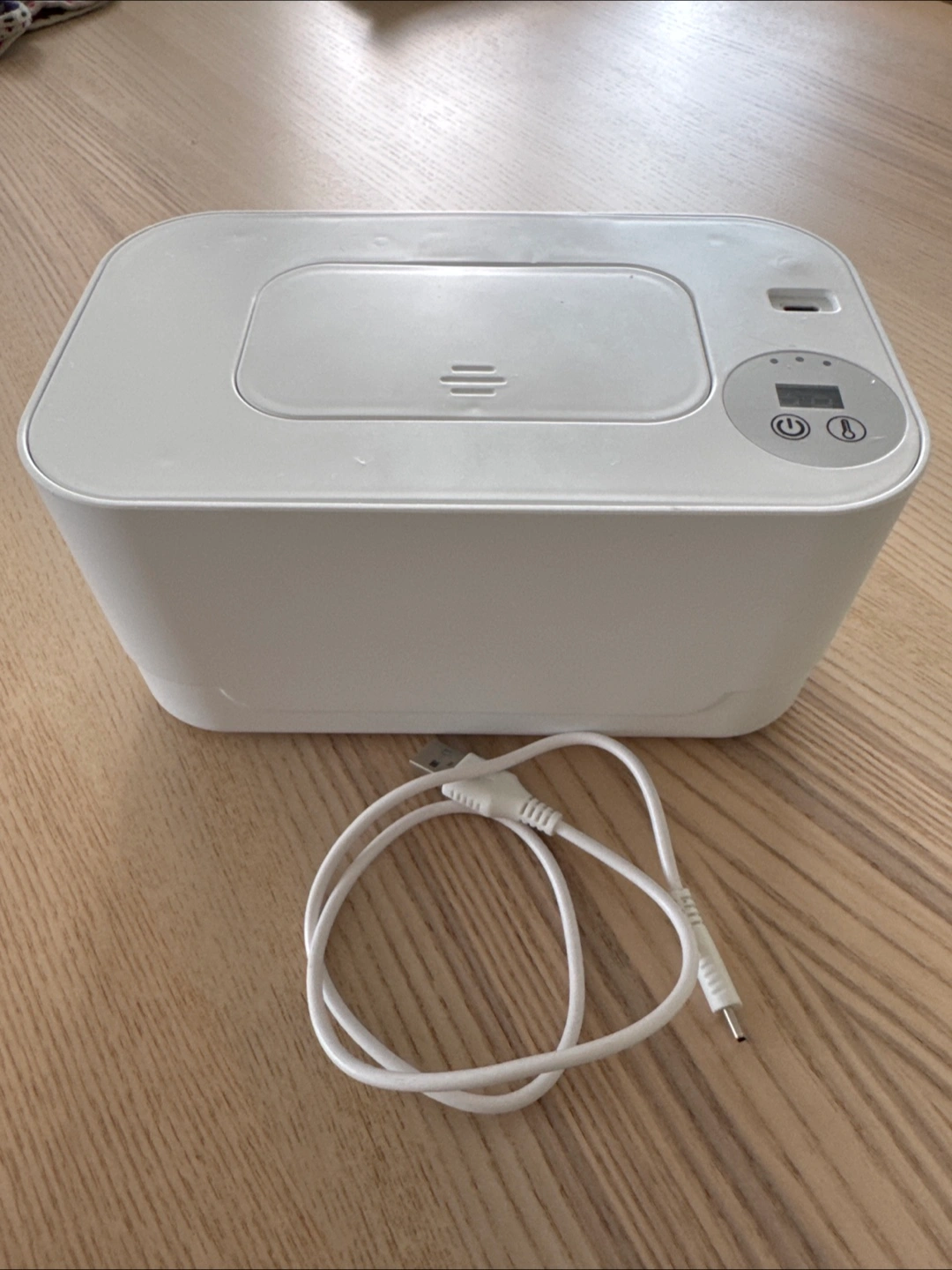 White wipe warmer and dispenser with thermostat and adjustable temperature. USB charging cable included . Compact design.