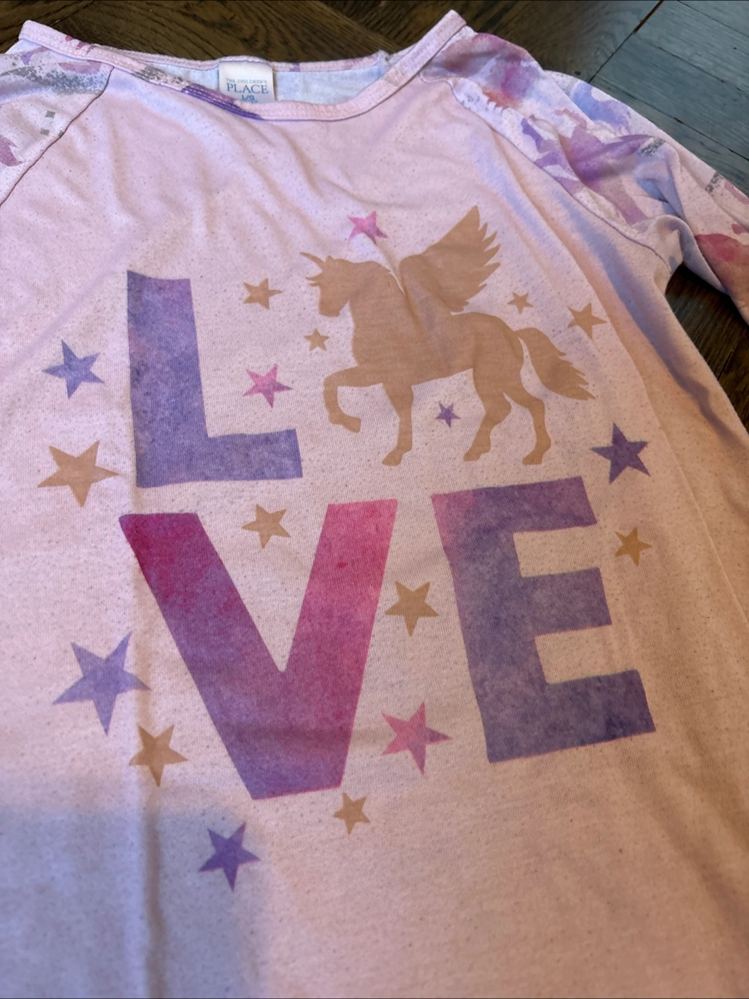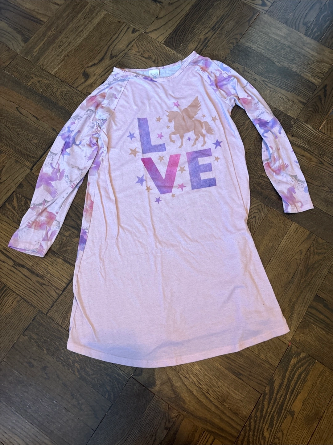 Girls' long sleeve nightgown. Pink with unicorn print. Features a 'LOVE' graphic with a unicorn and unicorns on back. Size 10/12.