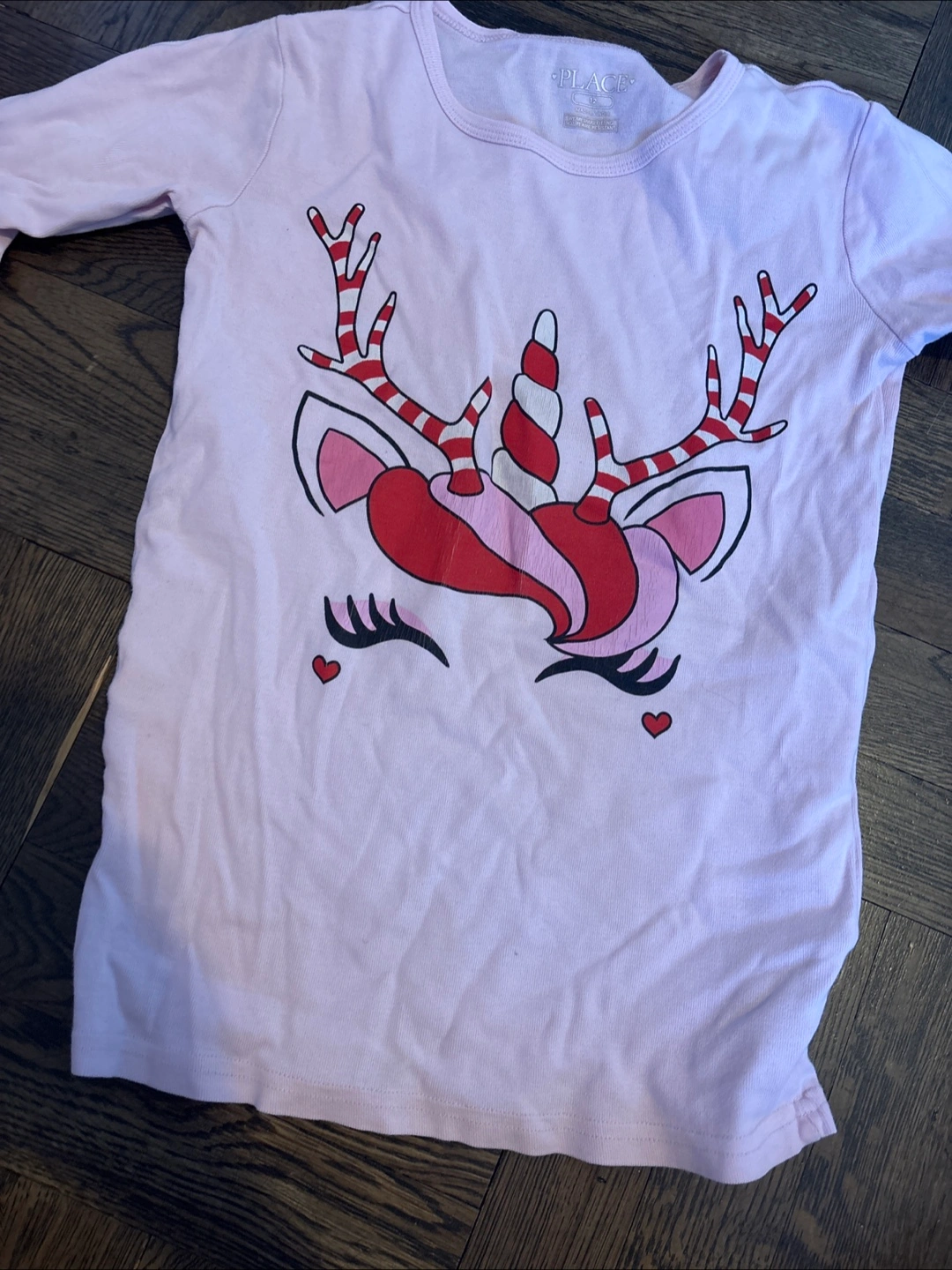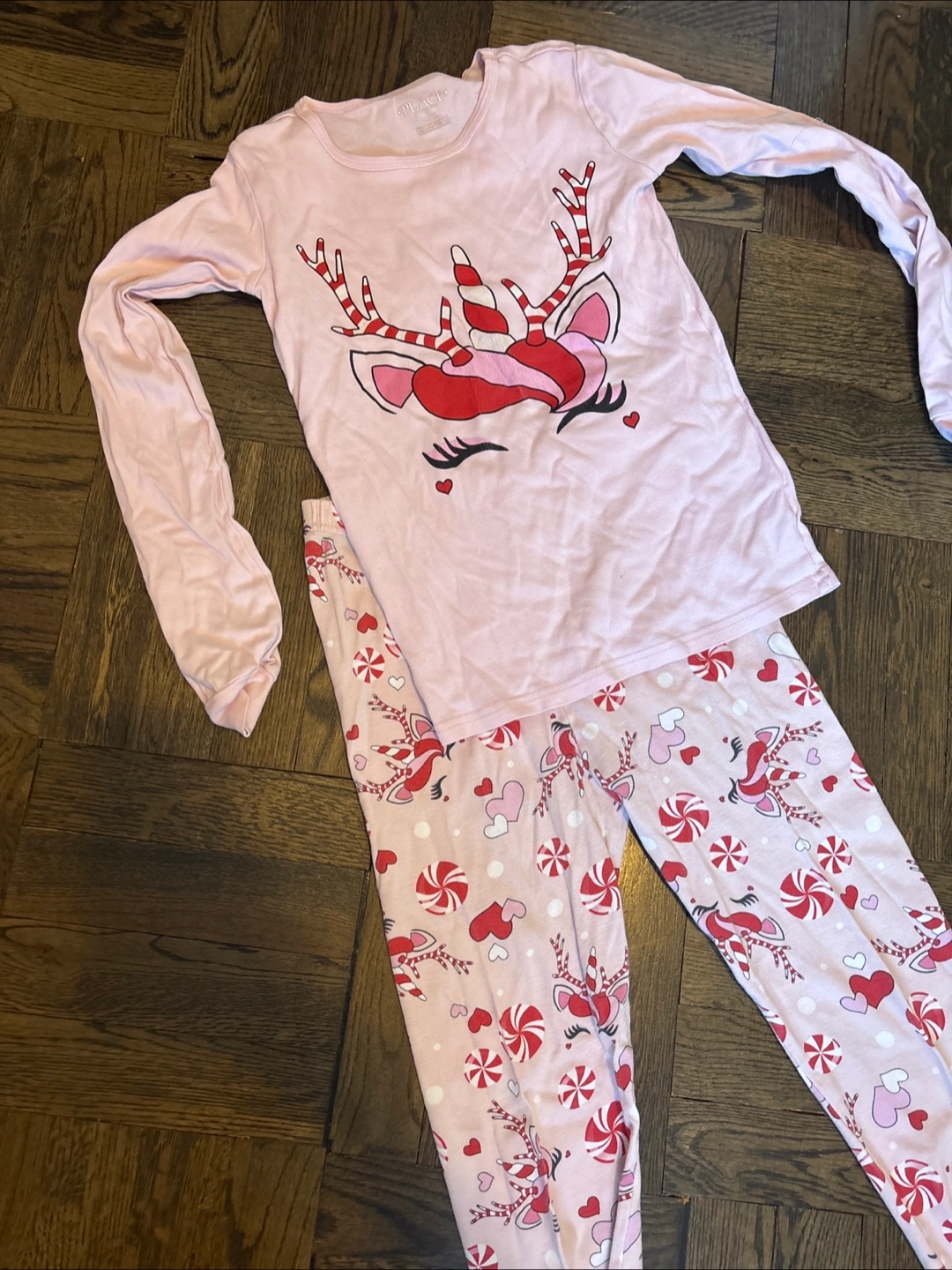 Long sleeve shirt and pants pajama set. Pink color. Features a cute unicorn/reindeer design with candy canes and hearts. Size 12.