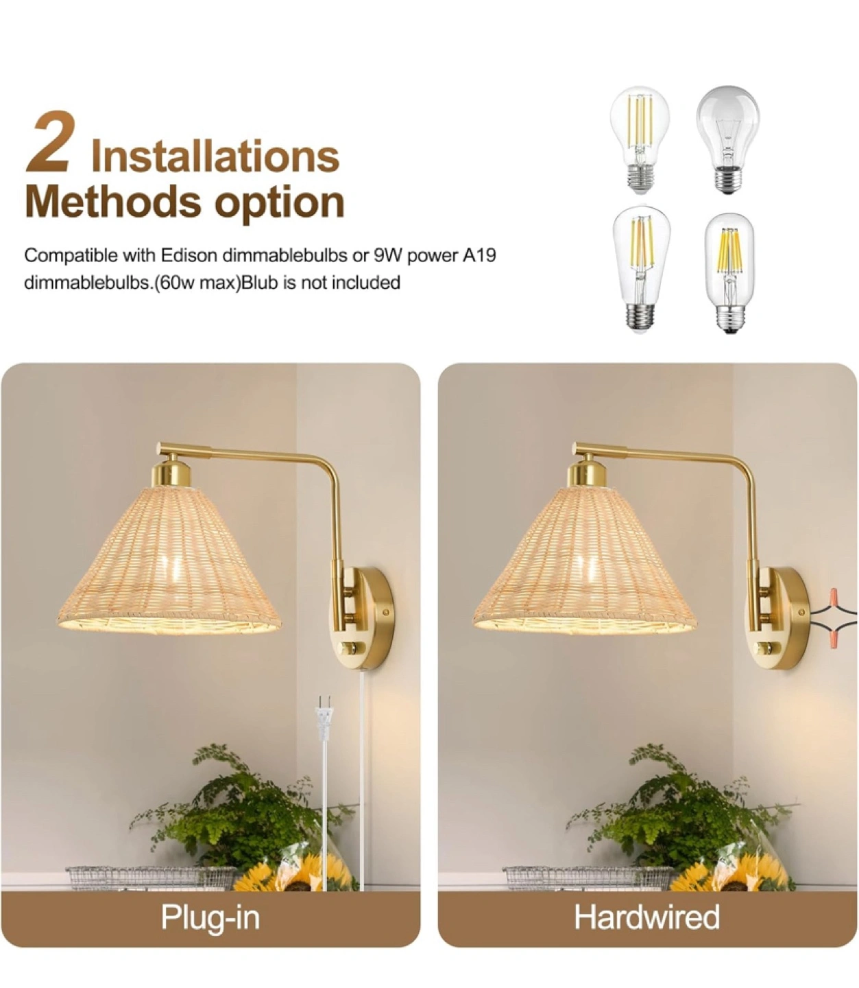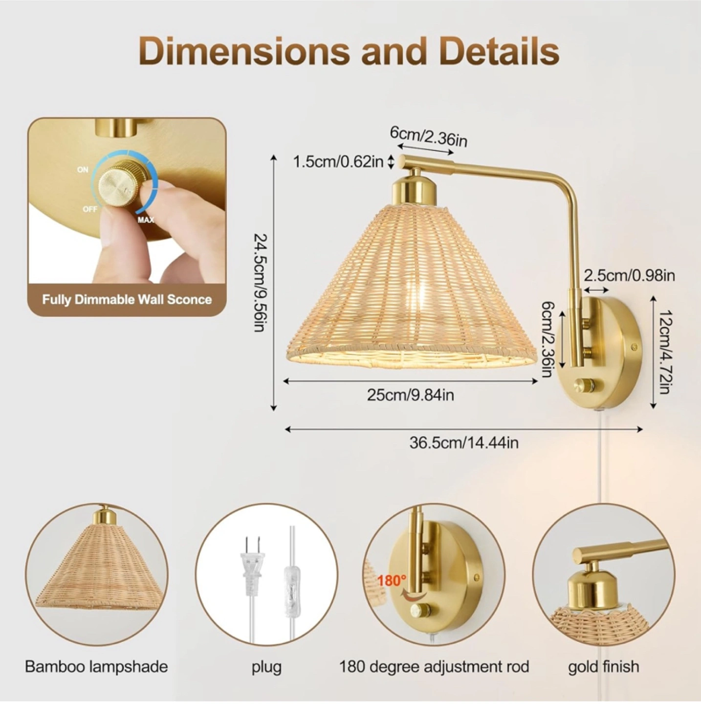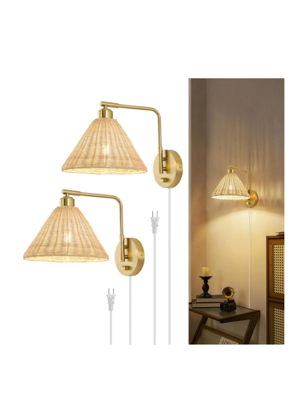 Set of two fully dimmable wall sconces. Features a gold finish and rattan shades. Plug-in or hardwire installation options. Adjustable arm. Great for bedrooms or living rooms.