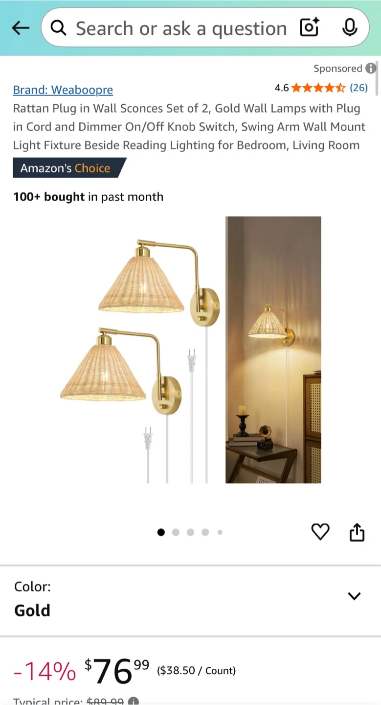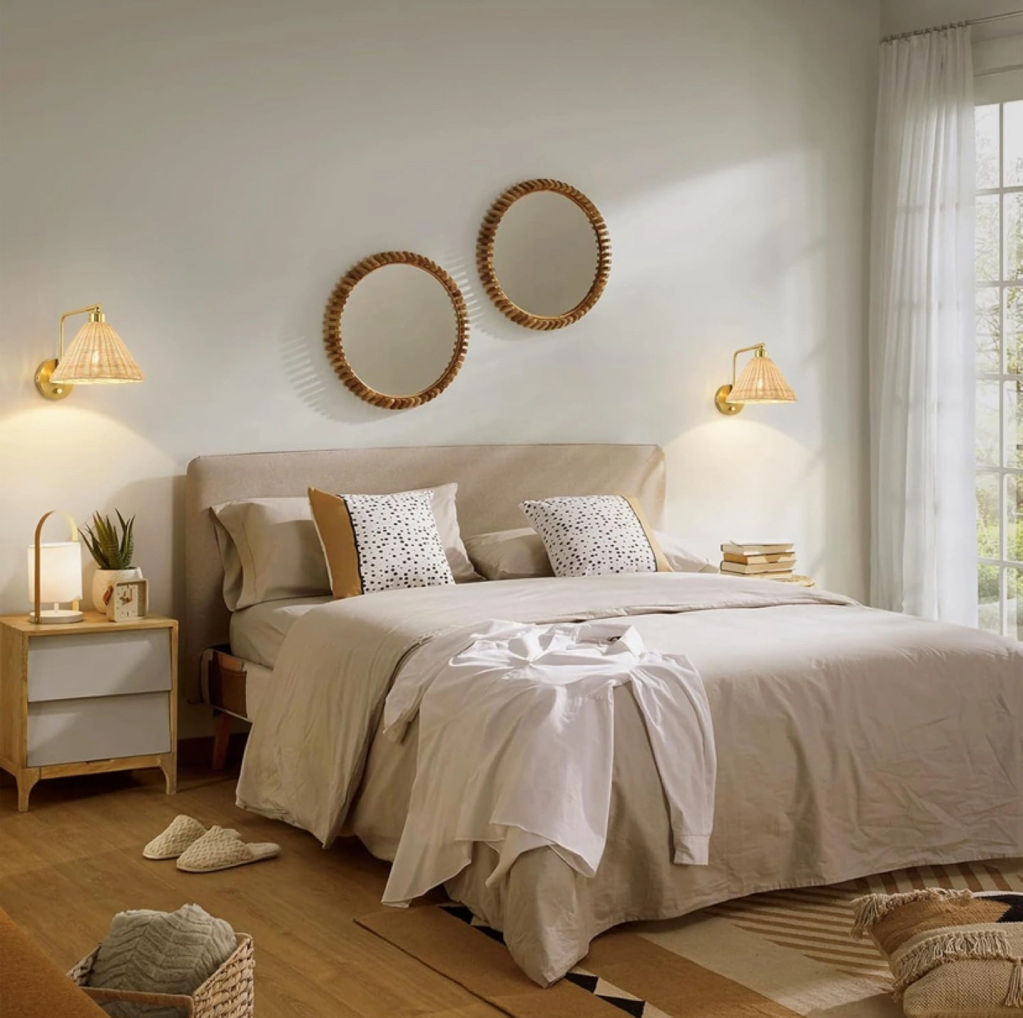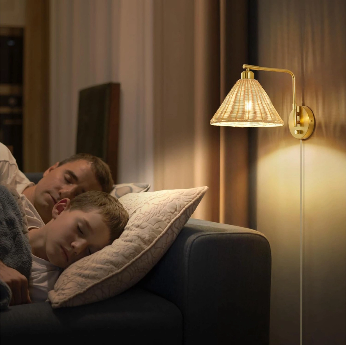Set of two fully dimmable wall sconces. Features a gold finish and rattan shades. Plug-in or hardwire installation options. Adjustable arm. Great for bedrooms or living rooms.