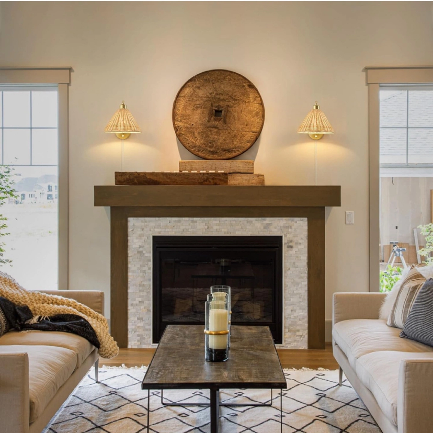Pair of Dimmable Gold Wall Sconces with Rattan Shades