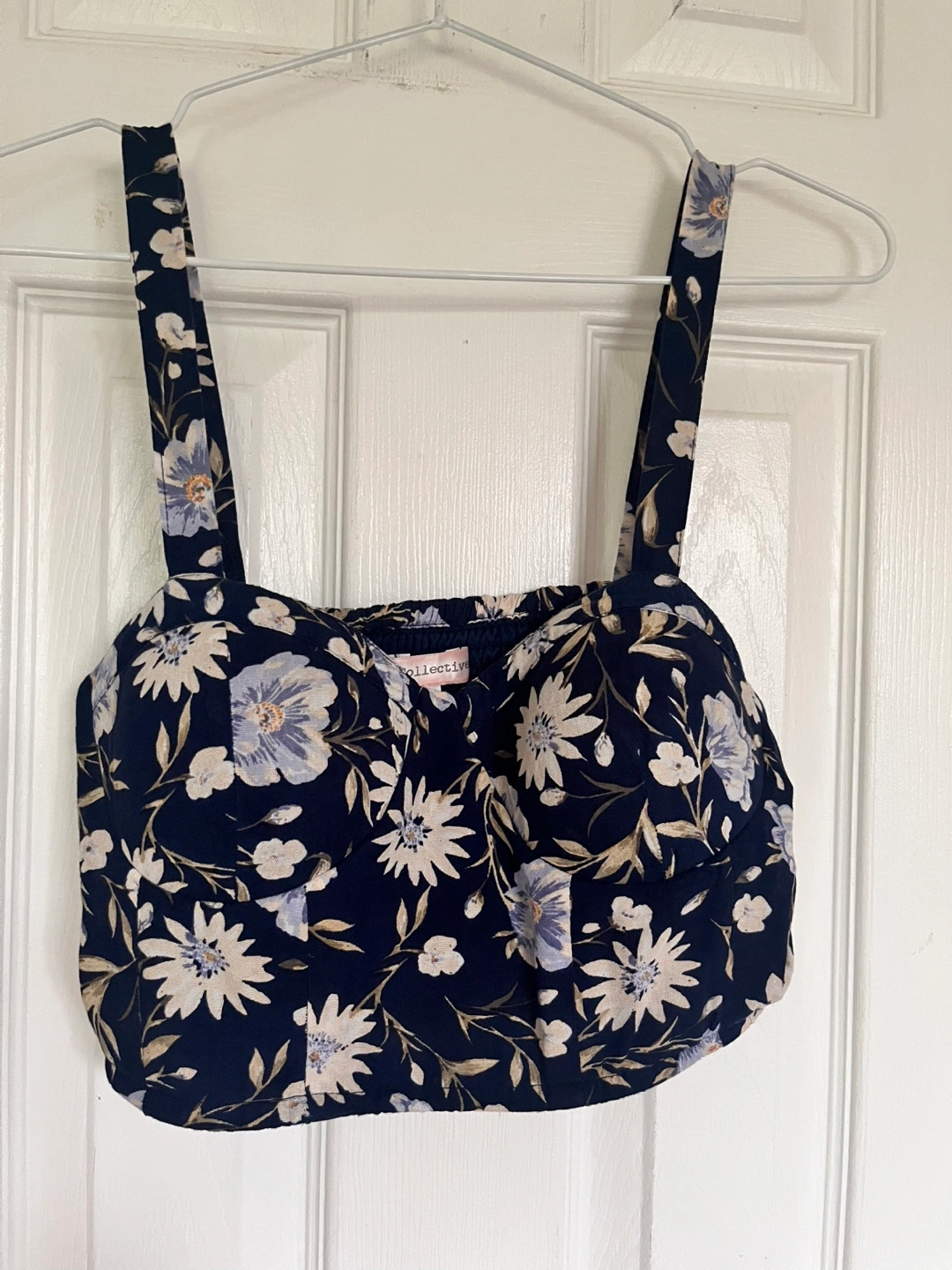 Gently used floral crop top with molded cups and shirred back. Straps are adjustable with buttons.