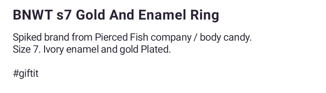 size 7 gold Plated and Ivory Enamel ring from Peirced Fish. gift able and new.