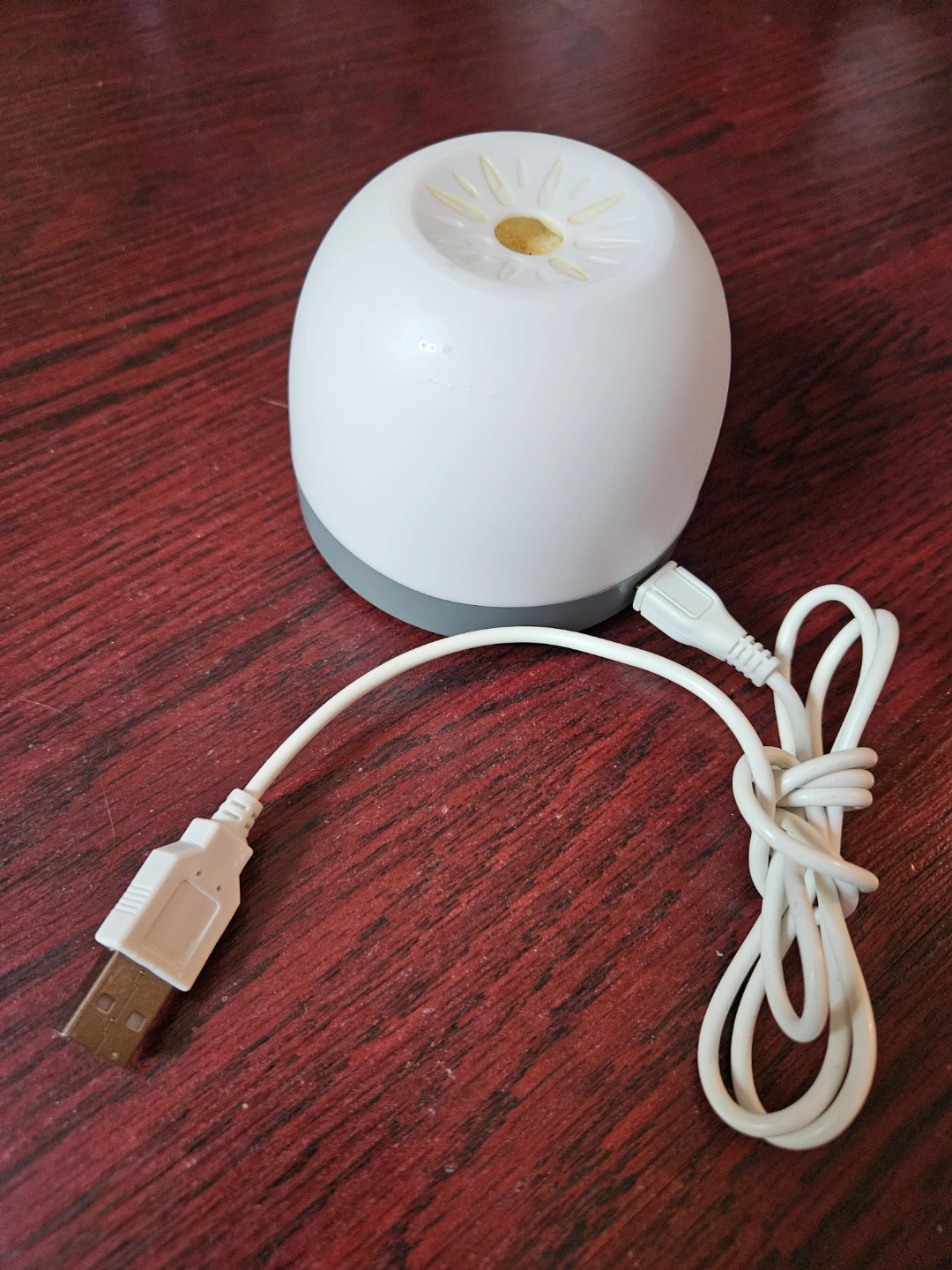 USB rechargeable aroma diffuser. Features a soft night light. Compact and portable design. Includes a replaceable scent pad ,BUT the only issue with this is the scent pad is kind stuck in there from the Oils being used on the pad for a while and not removing it and adding another one so the oil prob for kinda sticky .You can surely pull the pad out tho as its just kinda stuck from the oil as i said .Grey and white colour.
