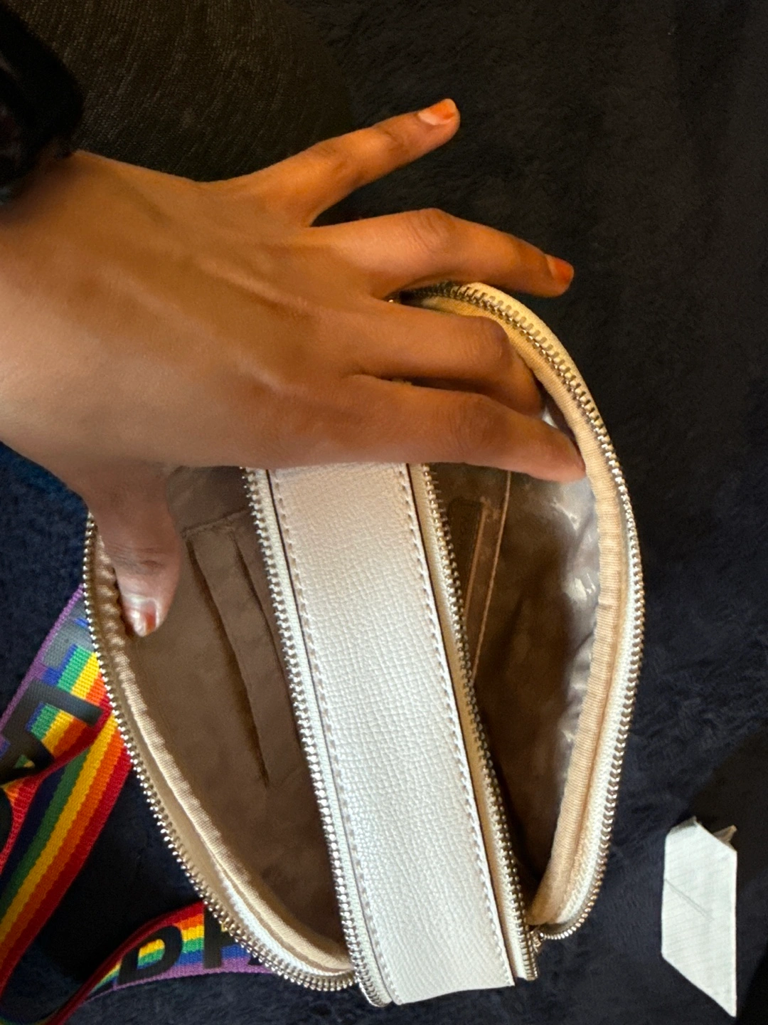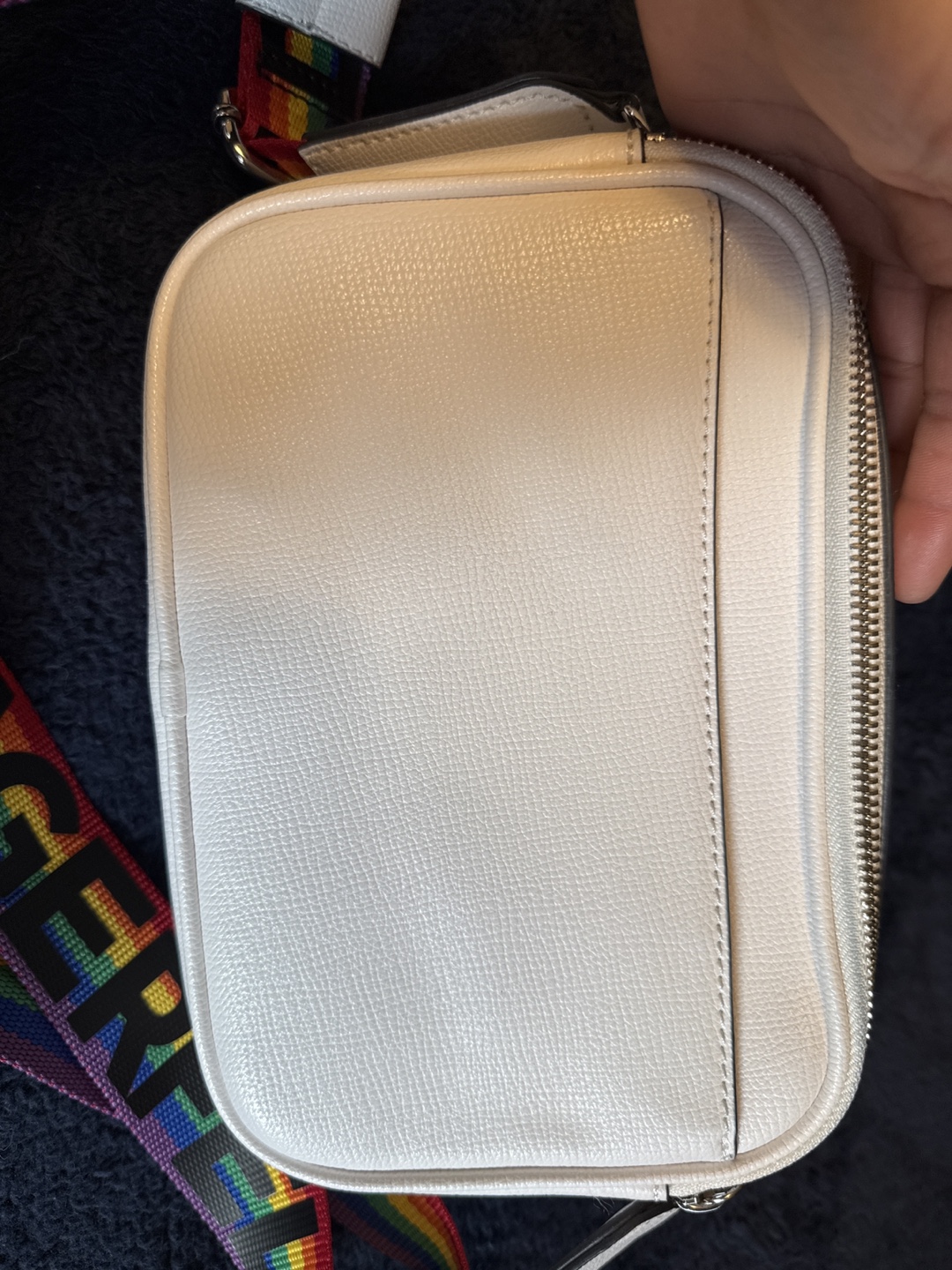 White leather crossbody bag. Rainbow striped shoulder strap. Zip closure. Small interior pockets. Excellent condition.