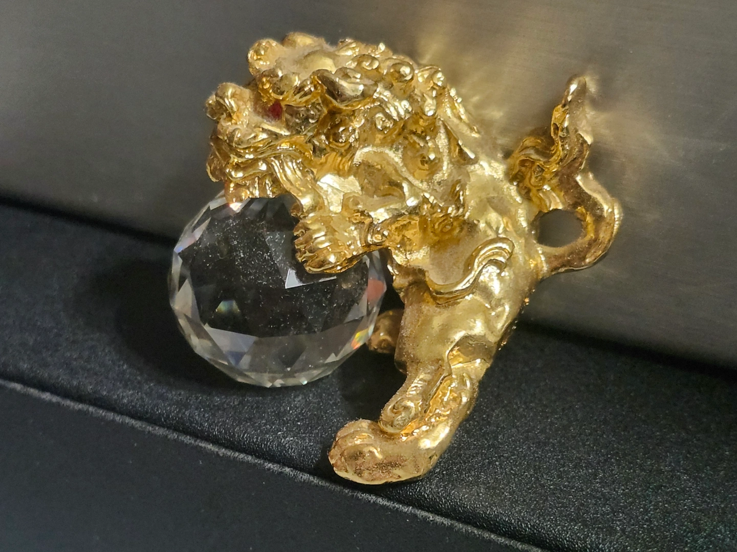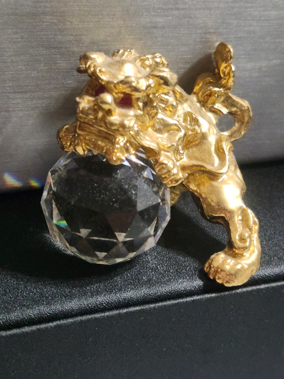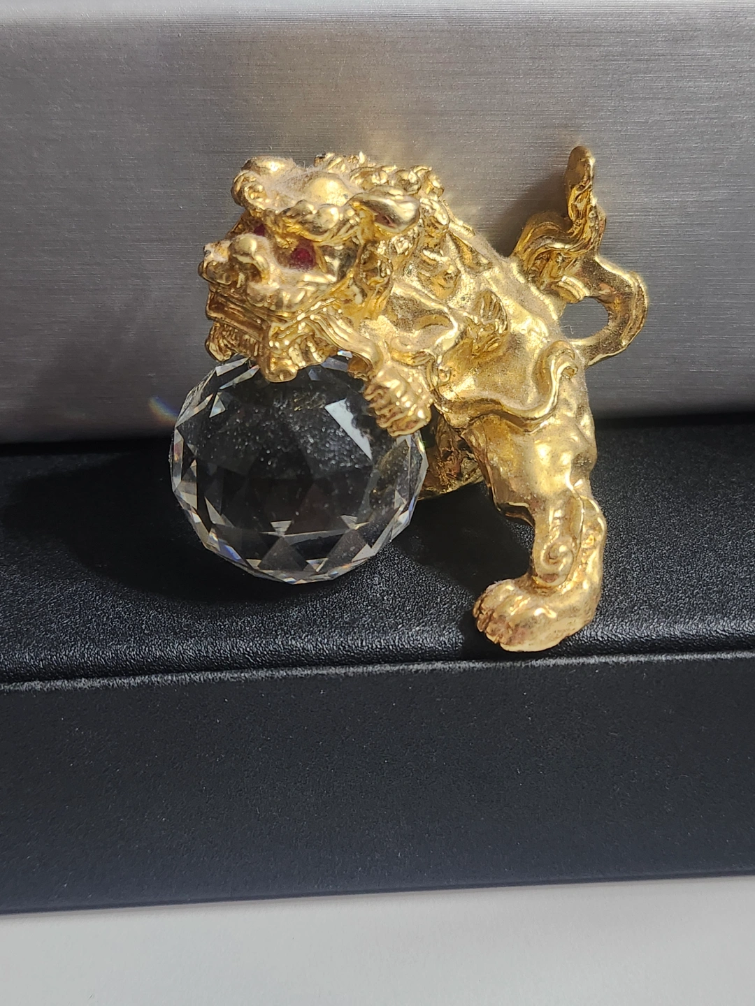 Small gold-coloured lion figurine holding a crystal ball. Looks like a paperweight or ornament.
