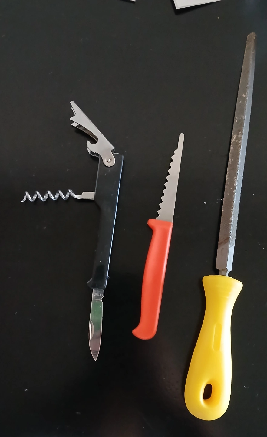 Pocket-sized multi-tool features corkscrew, bottle opener, and knife. Small hand saw with orange handle is for pumpkincarving. Metal file with yellow handle.,$7 for everything together.