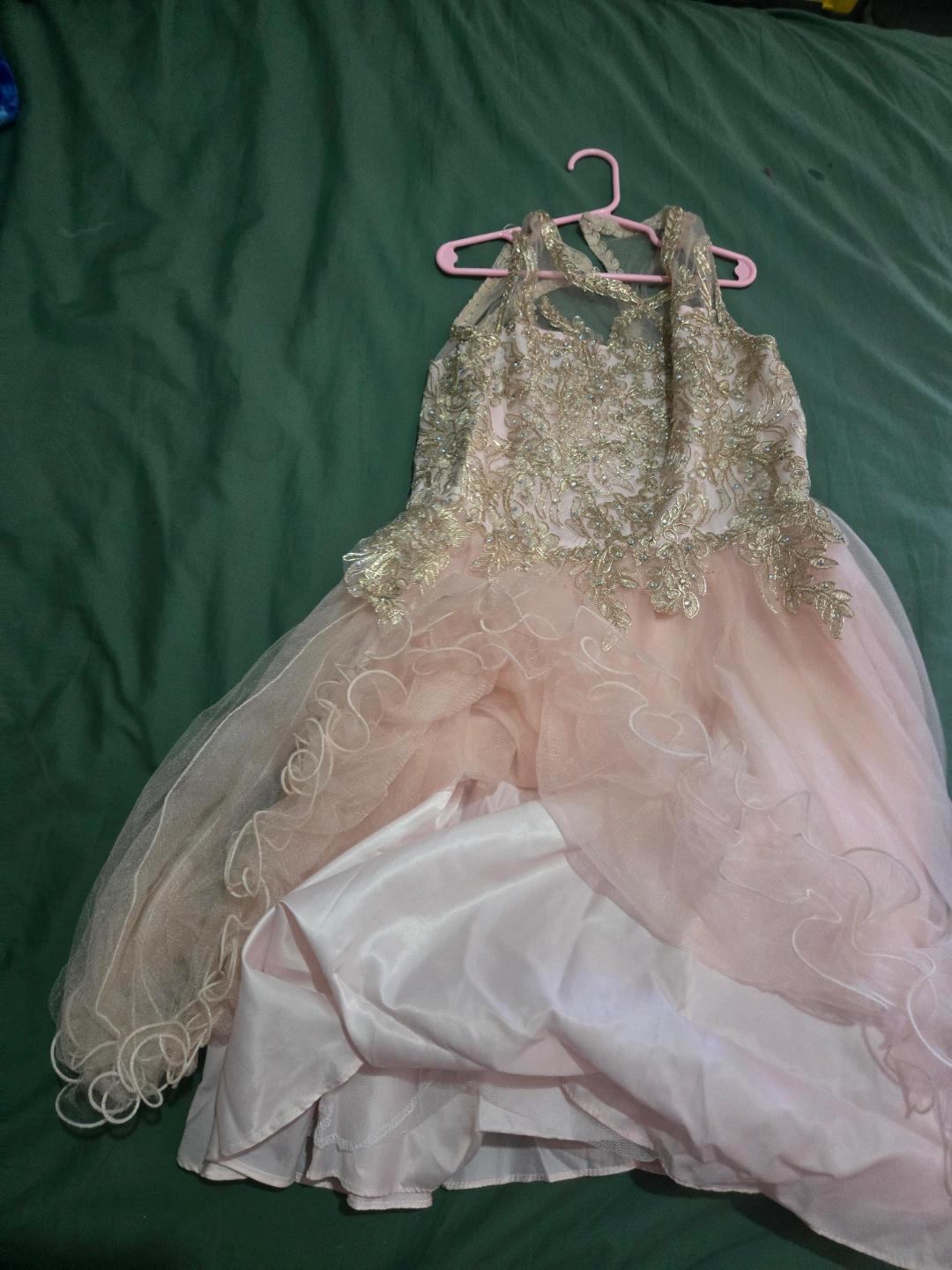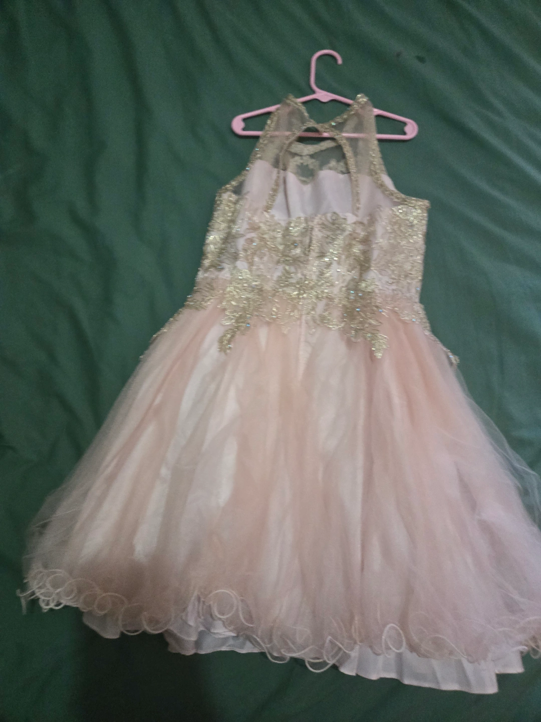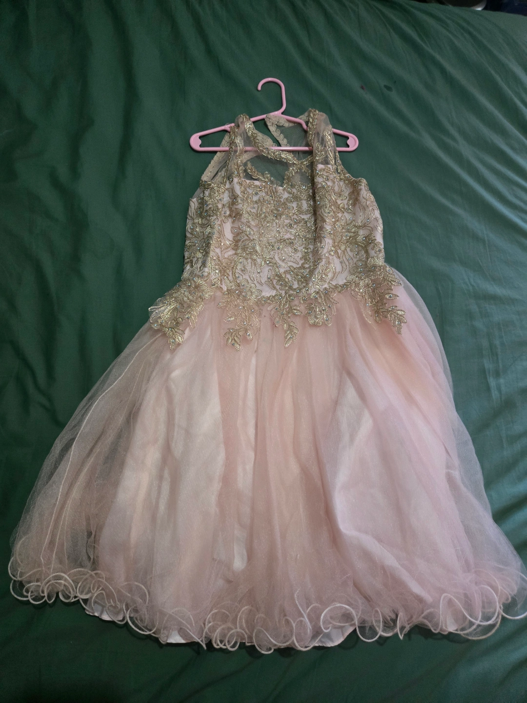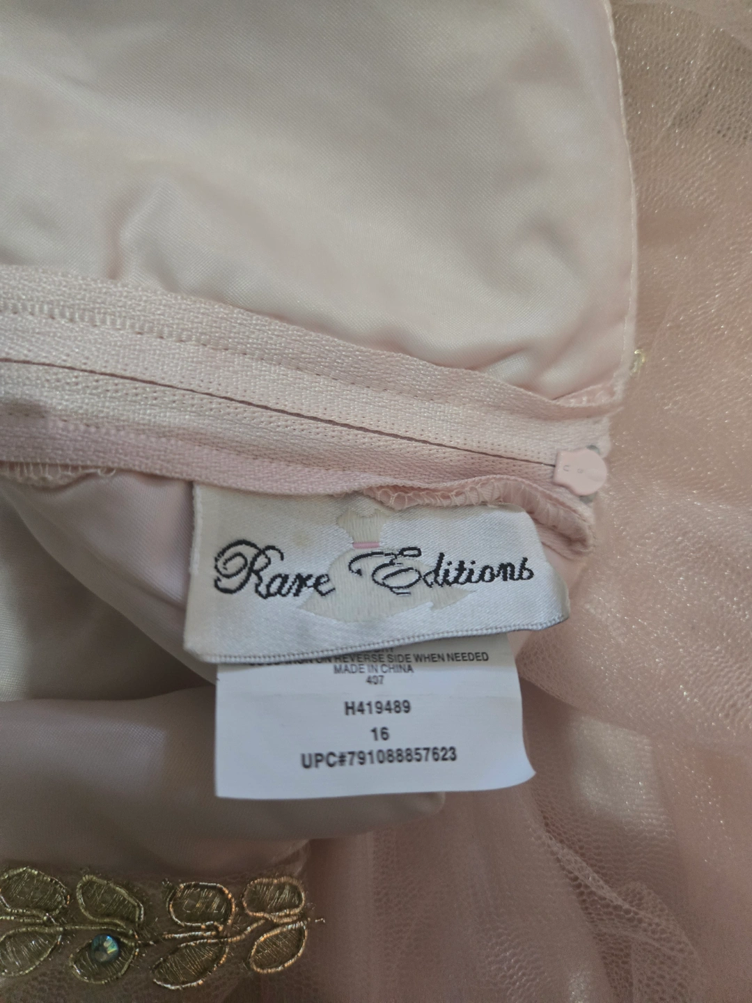 Pretty blush pink dress. Gold embroidery accents. Layered tulle skirt. Back zipper closure. Size 16.
