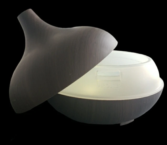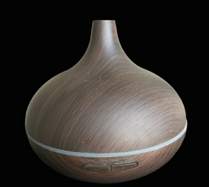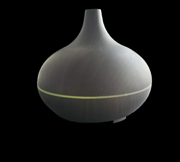 Essential Oil diffuser. Dark wood grain finish. Features timer settings and light options. Gently diffuses essential oils.