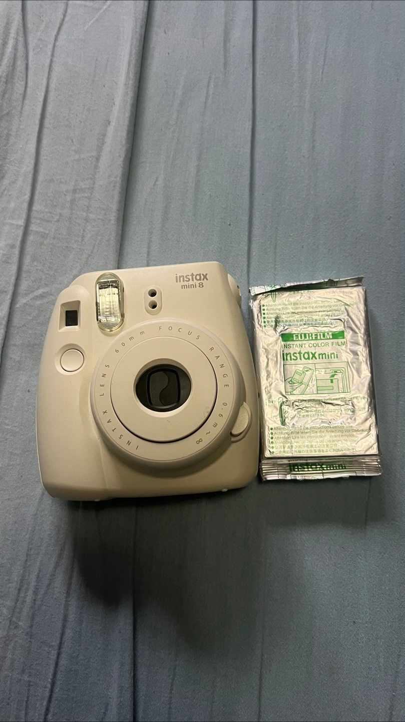 Cream coloured Instax Mini 8 camera. Includes a pack of Instax Mini film. Good condition.
