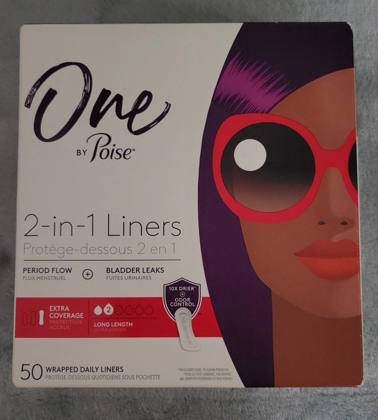 New, unopened box of 50 Poise One by Poise 2-in-1 liners. Long length, extra coverage. Designed for period flow and bladder leaks. 10x drier odour control.